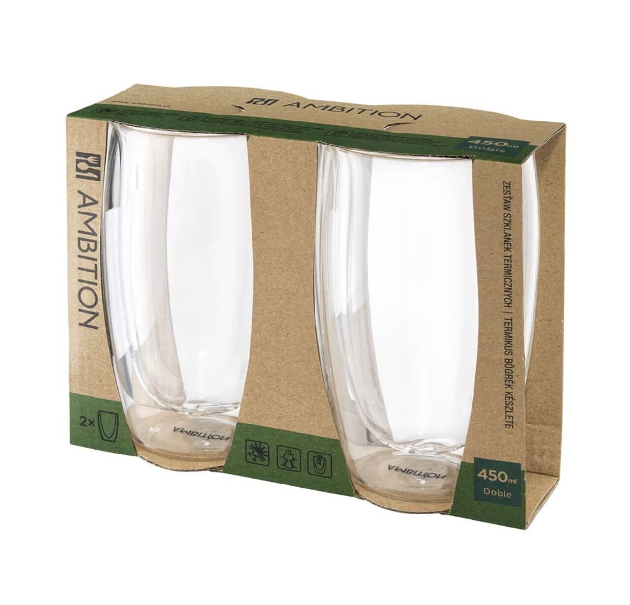 2 db Dupla pohár készlet, Ambition, 450 ml, edzett üveg, átlátszó