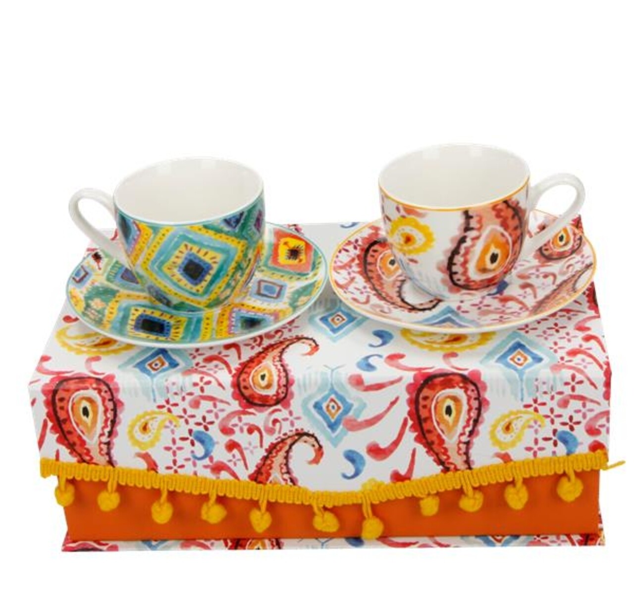 A két kis csészéből és csészealjból álló készlet nagyon aranyos, színes és vidám. Minden csésze egyedi, saját tervezésű. A csészék az irodában és otthon is használhatók kávéhoz és teához egyaránt.
