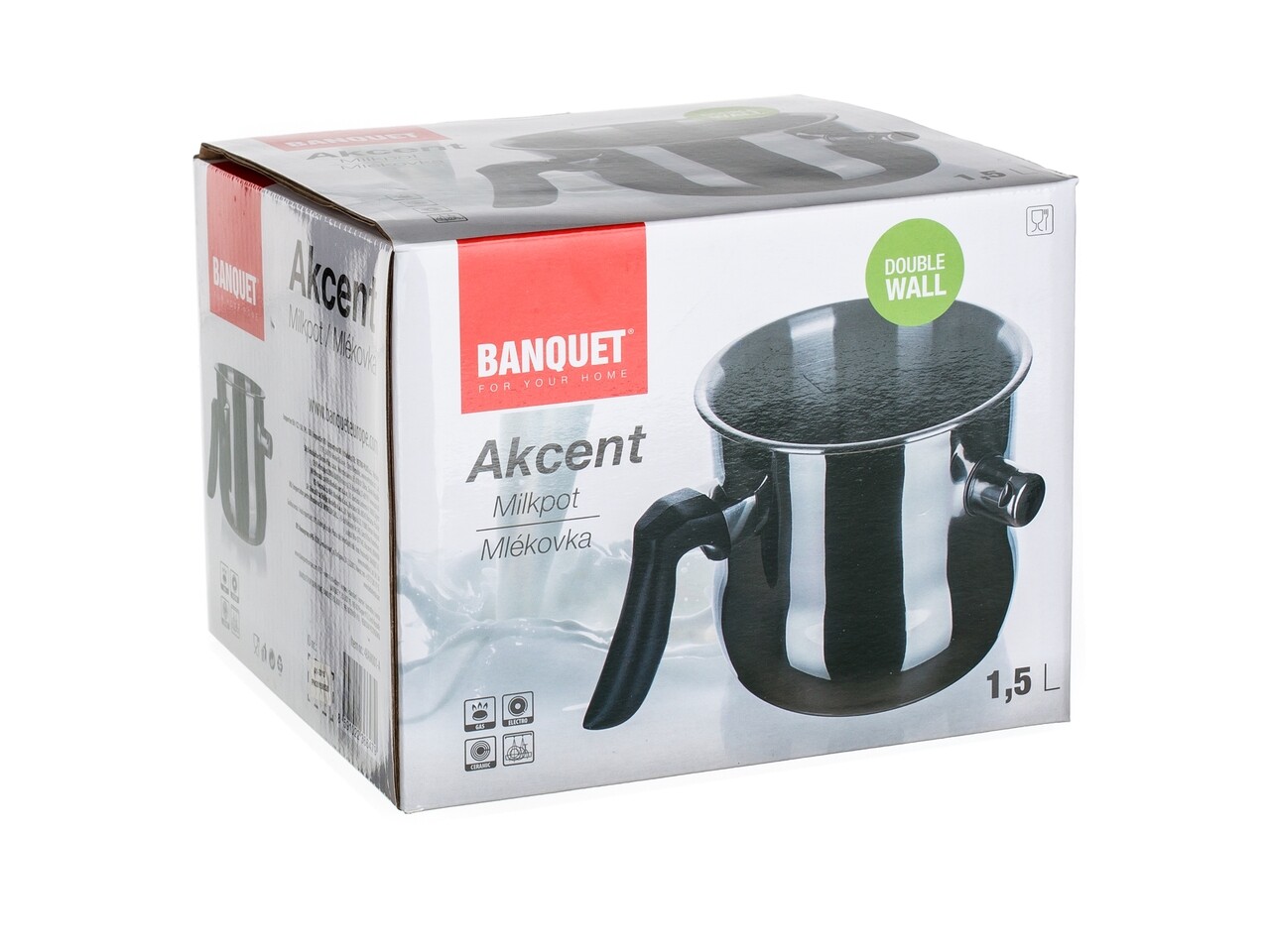 Az AKCENT 1,5 literes rozsdamentes acél főzőedény dupla falú, fedő nélküli, műanyag fogantyús, fényes külső felületű, matt belső felületű tejeskancsó. Az edény oldalán van egy szelep, amely megtelik vízzel és fütyül, amikor felforr.