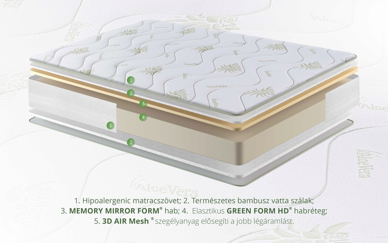 A Green Future és az ortopédiai szakemberek által kifejlesztett Aloe Vera Memory matrac ötvözi a Green Form HD® rugalmas hab ortopédiai tulajdonságait az Aloe Vera kivonat és az allergia elleni bambuszszálak jól ismert gyulladásgátló tulajdonságaival.