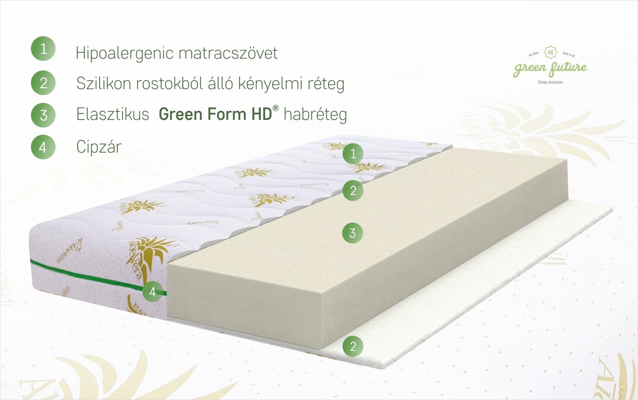 A Green Form HD elasztikus hab matrac alapja egy bőséges szilikonrost réteggel kombinálva biztosítja a test anatómiai megtámasztását és a gerinc helyes helyzetét, hátfájás nélkül alvás közben.