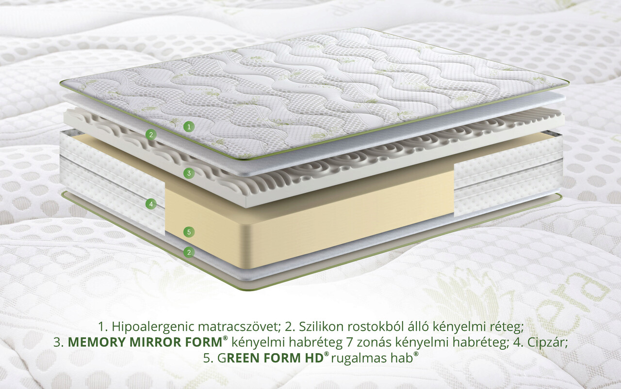 A Green Form HD® habhátlap fejlett technológiája a Memory Mirror Form® réteggel együtt biztosítja partnere számára a mozdulatlan alvást.