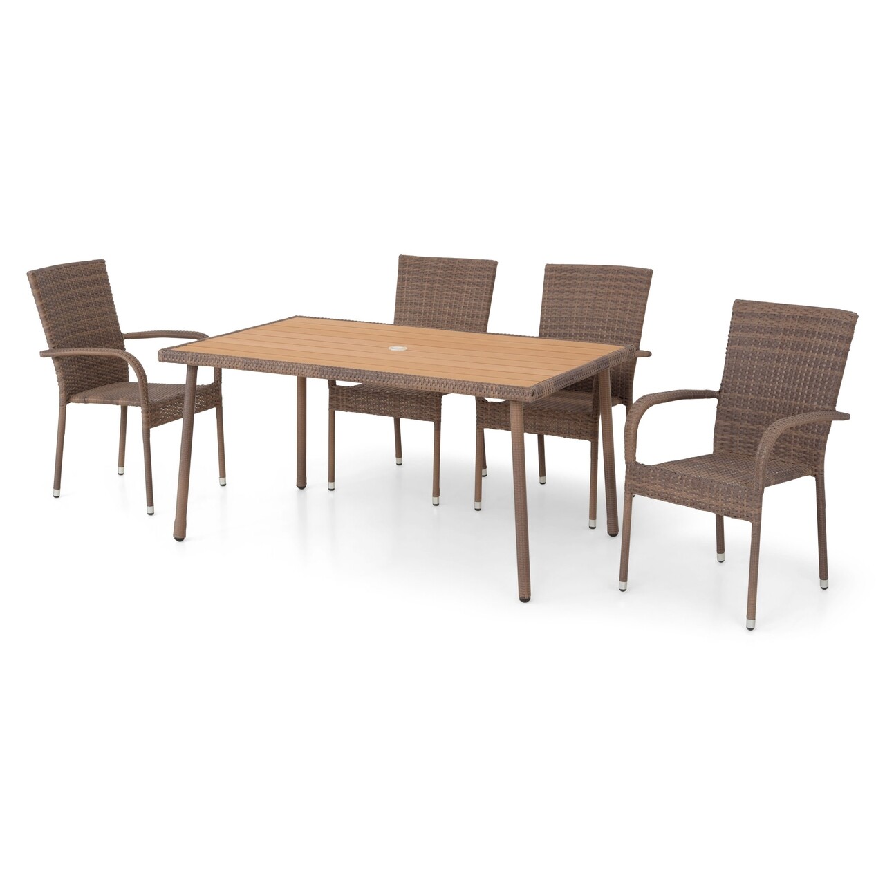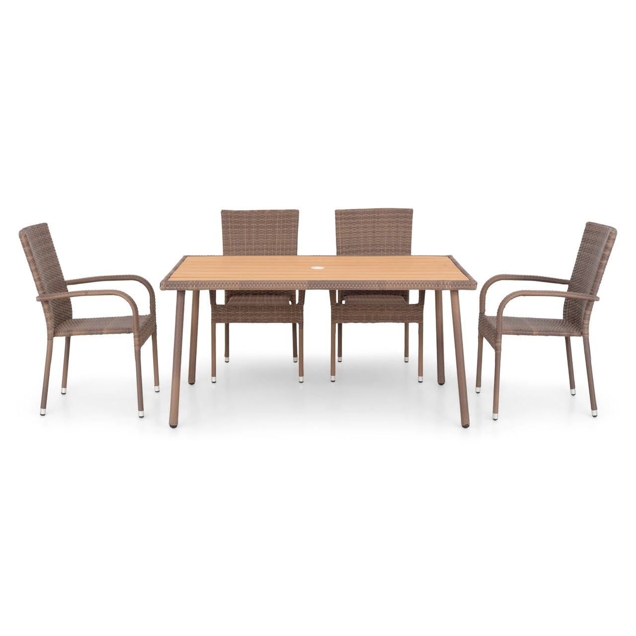 Az Amaya garnitúra praktikus, sokoldalú és ideális választás egy olyan berendezés kiegészítésére, ahol a kényelem garantált. A termékek acélszerkezeten készülnek, és barna színű műszálas borítással, az asztal pedig fa utánzatú asztallappal rendelkezik, amely ráadásul vízálló és ellenáll az UV-sugarak színeket károsító hatásának.