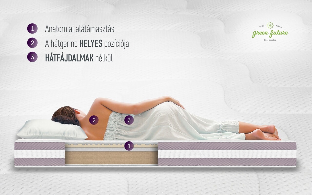 A Green Form HD® elasztikus habból készült, nyitott celluláris szerkezetű matracalap biztosítja az anatómiai testtartást és a gerinc helyes helyzetét hátfájás nélkül alvás közben.