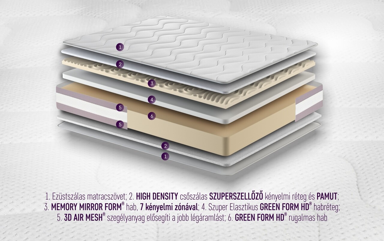 3 cm szuperelasztikus Green Form HD® hab, amely mini rugókból álló köztes rétegként működik a testtámasztó alap és a memória alap között. Célja, hogy javítsa a test alátámasztását a deréktáji, a nyaki és a térd területén.