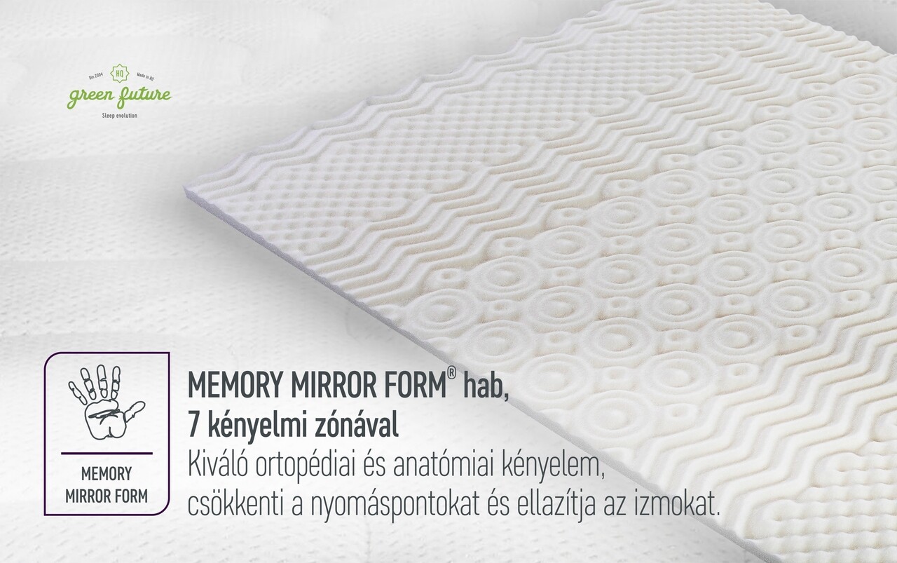 4 cm Memory Mirror Foam®, amely reagál a testhőre és a testhez idomul, kiküszöböli a nyomáspontokat alvás közben, hogy ellazítsa az izmokat és biztosítsa az egészséges vérkeringést;