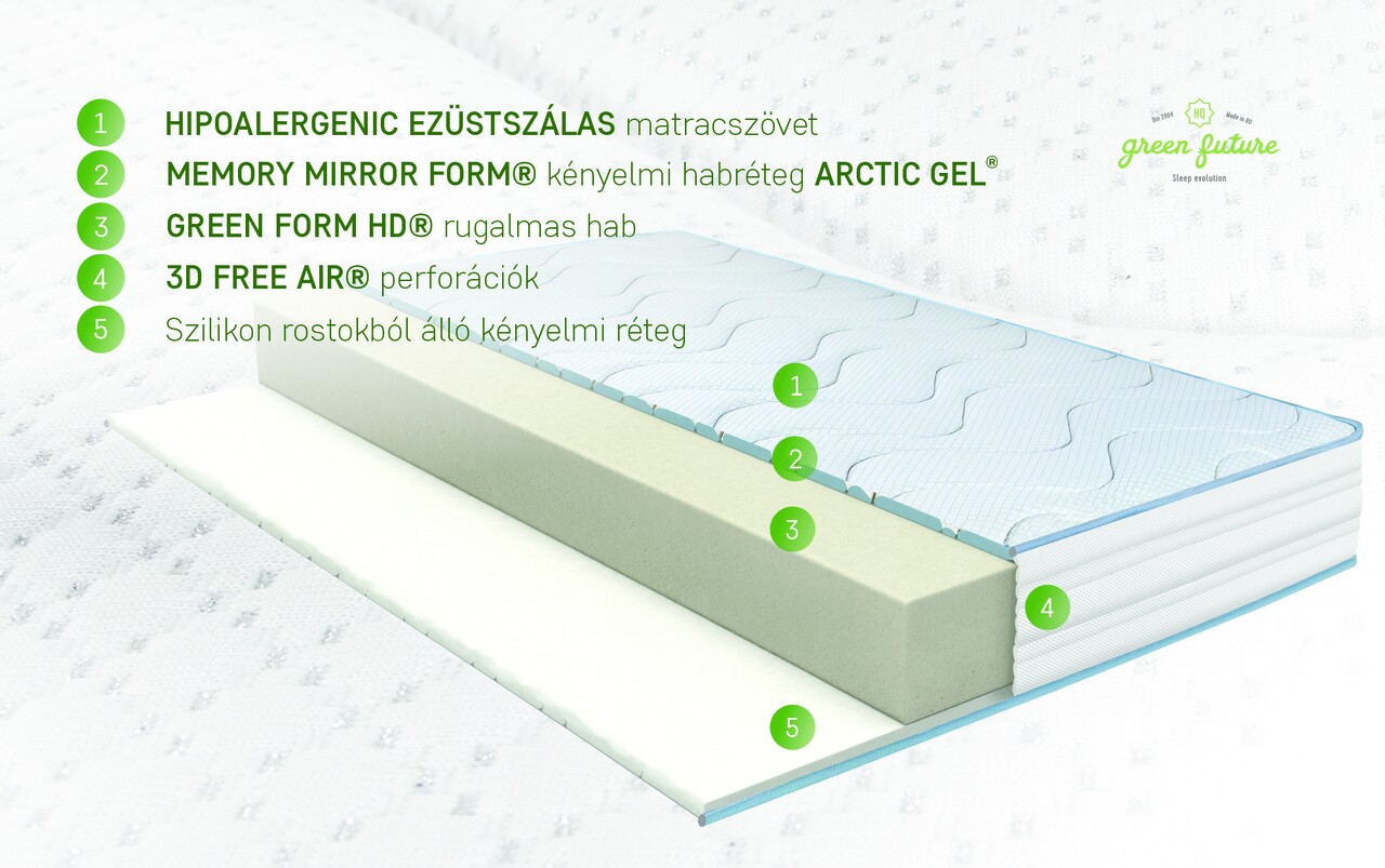 A Green Future és az ortopédiai szakemberek által kifejlesztett Argentum Therapy matrac ötvözi a Green Form HD® rugalmas hab ortopédiai tulajdonságait a Green Therm Memory hab, az Arctic Gel® hideg részecskék és az ezüstionok antimikrobiális tulajdonságaival.
