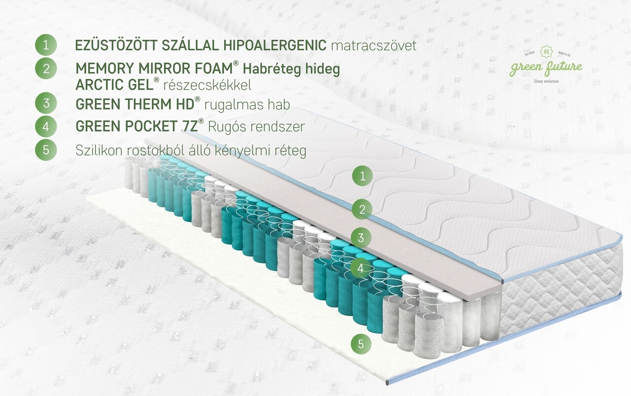 A Green Future és az ortopédiai szakemberek által kifejlesztett Argentum Therapy Memory Pocket matrac egyesíti az egyedi csomagolású Pocket rugók technológiáját a Green Form HD® elasztikus habbal és a Green Therm Memory hab termálit az Arctic Gel® hideg részecskékkel.