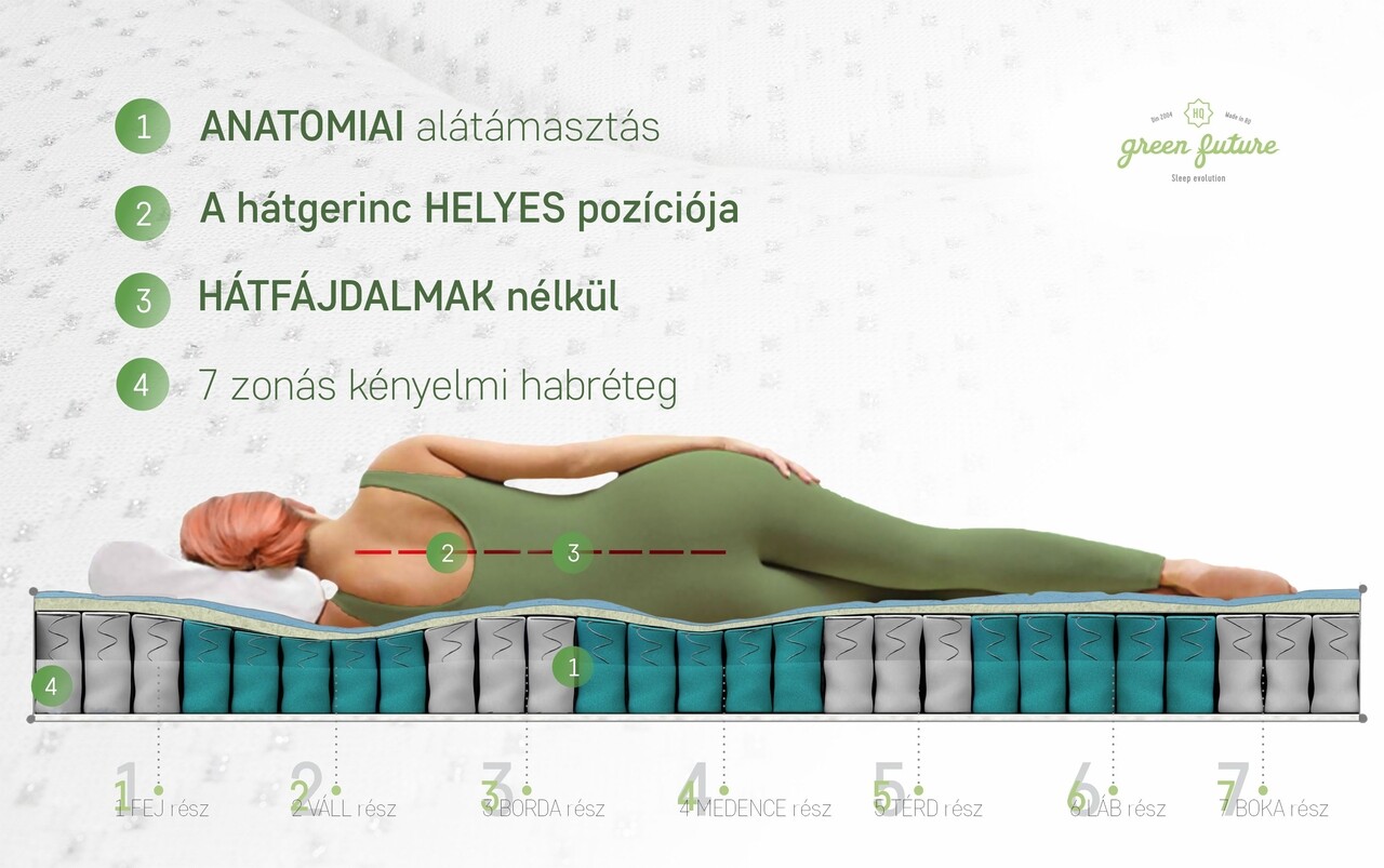 A rugók egyenként textil dobozokba vannak csomagolva, és egymástól függetlenül hatnak a rájuk gyakorolt nyomásra, ezáltal tökéletesen anatómiailag formázva a testet. A köztük lévő kapcsolatok nélkül nem kapcsolja be a többi rugót mozgásba, nagy stabilitást és nulla kényelmetlenséget kínálva az alvó partner számára. Ezenkívül a 7Z Green Pocket® rendszer lehetővé teszi a testrészek eltérő megtámasztását attól függően, hogy milyen nyomást gyakorolnak rájuk a matrac felületére, hogy biztosítsák a gerinc csigolyáinak helyes és egészséges összehangolását.
