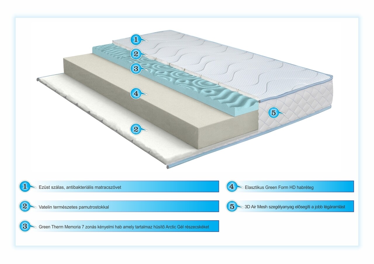 A puha tapintású szövet, ezüstionokkal, pamutszálas vattával van steppelve. A nagyvonalú komfortréteg 6 cm -es Green Therm Memory habból áll, amelyek Arctic Gel® részecskékkel reagálnak a testmelegre és a penészedésre, így megszüntetik az alvás alatti nyomáspontokat, ellazítják az izmokat és biztosítják a megfelelő vérkeringést.