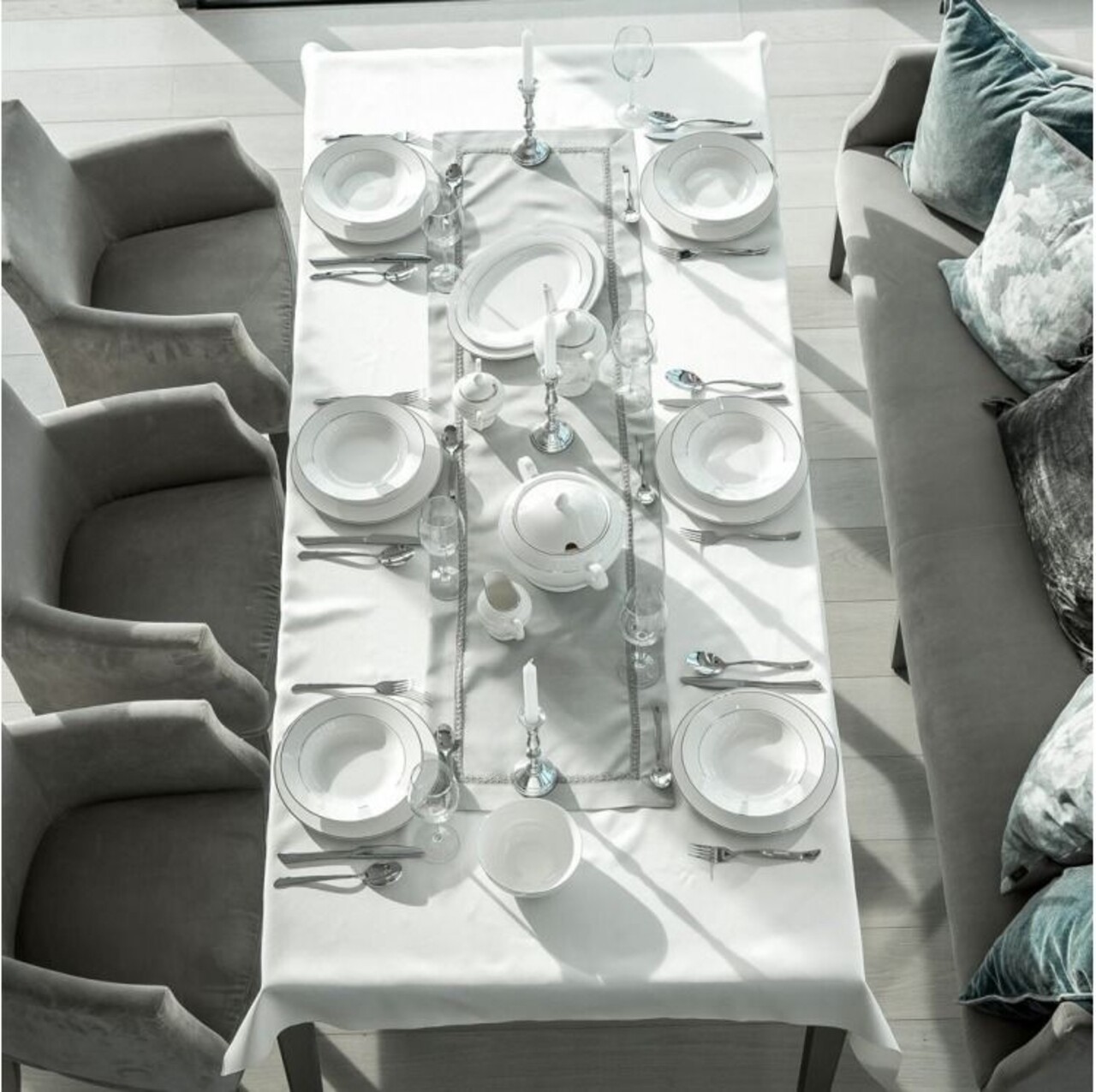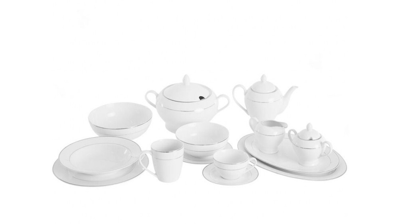 Kivételesen elegáns porcelán vonal, finom ezüst vonalakkal díszítve. Klasszikus formája és finom díszítése tökéletessé teszi hagyományos és modern belső terekbe egyaránt. Kiváló minőségű New Bone China porcelán, fehér-szürke árnyalattal, tartós és nagyon exkluzív megjelenésű.