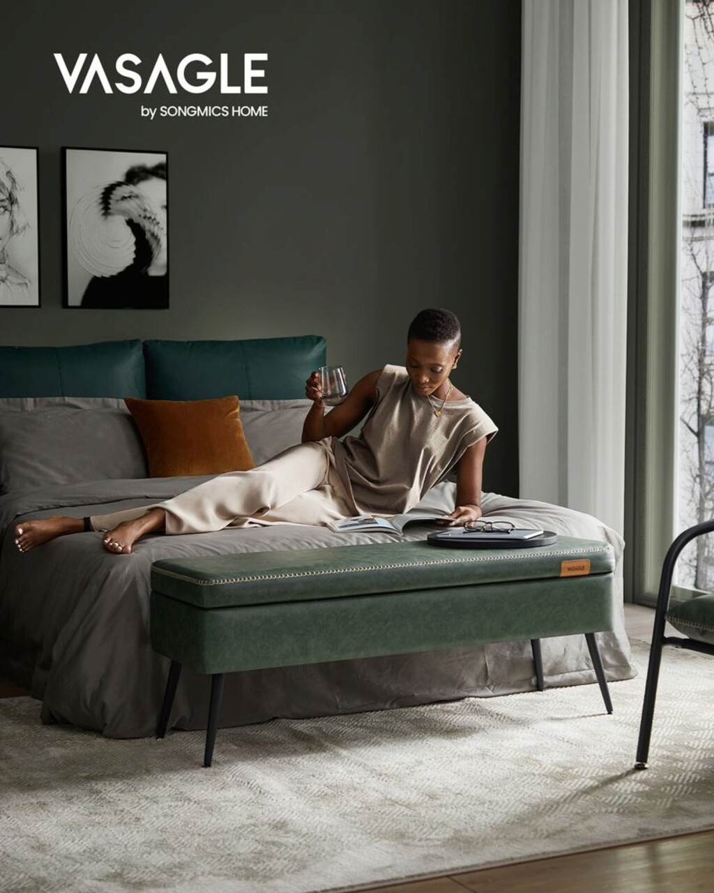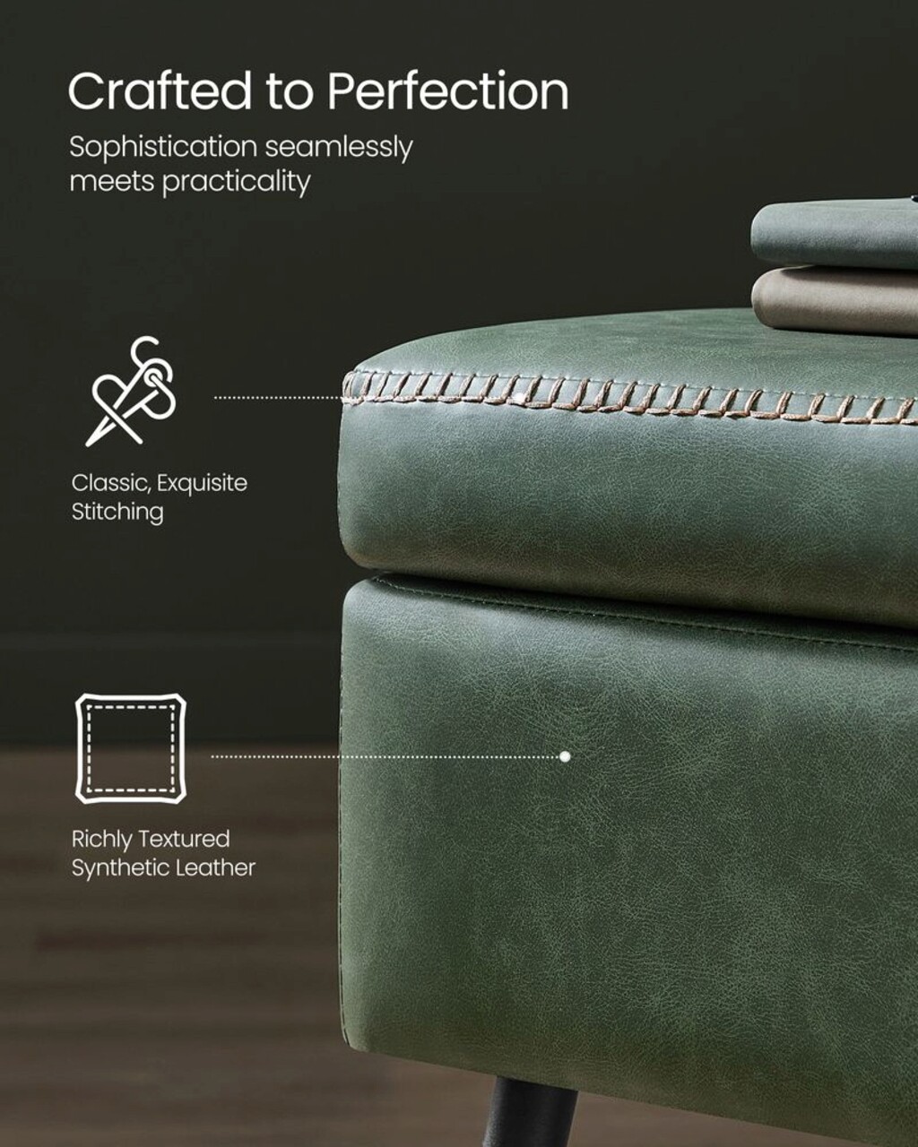 Bancheta cu spatiu de depozitare Ekho, Vasagle, max 300 kg, 120 x 40 x 45 cm, piele ecologica/otel, verde padure