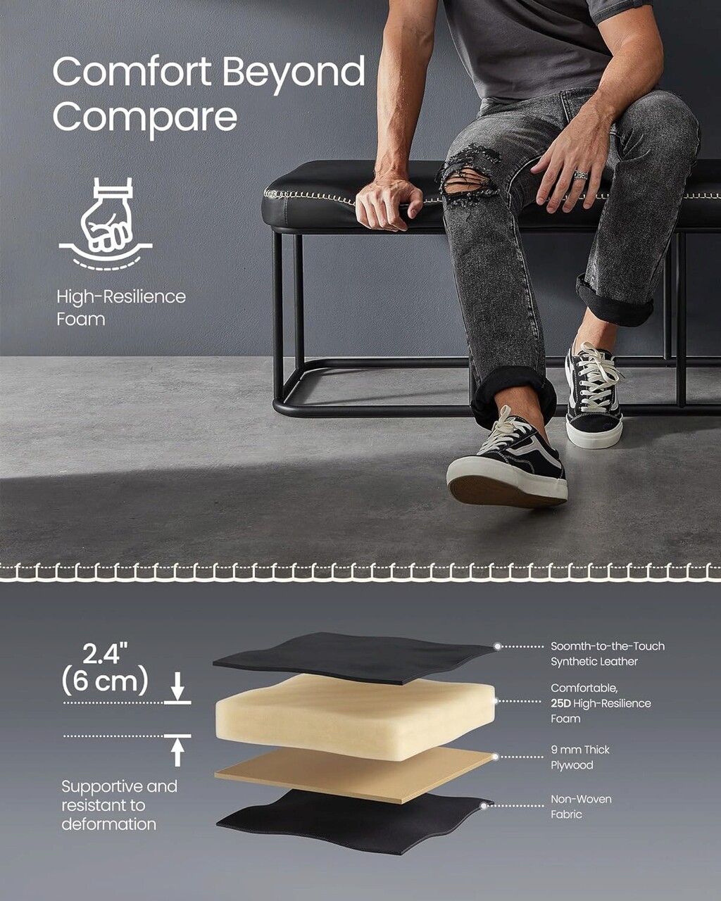 Asamblare fara efort, ingrijire usoara Nu numai ca banca pentru dormitor este usor de asamblat, dar este, de asemenea, confectionata din piele sintetica rezistenta la uzura, care este usor de ingrijit. Urmati pur si simplu instructiunile clare pentru a atasa picioarele si sunteti gata.