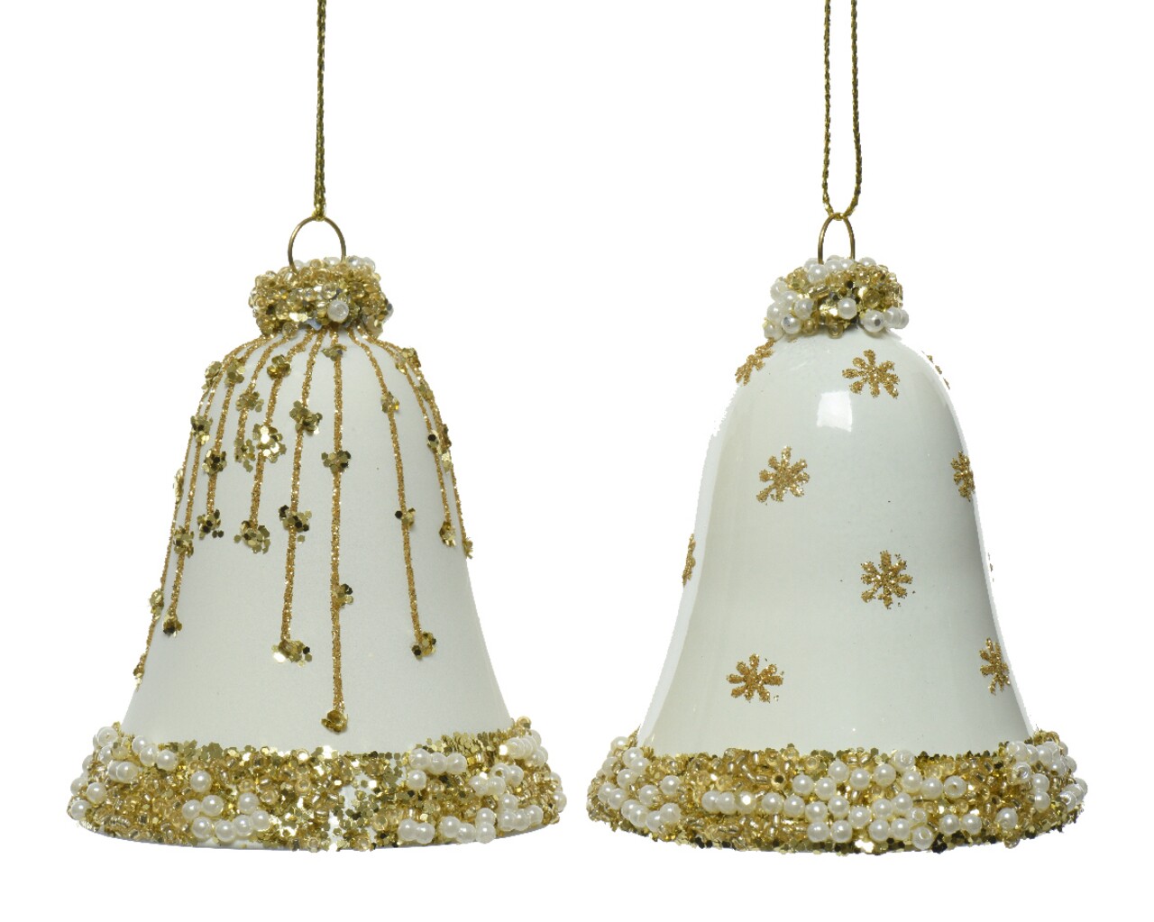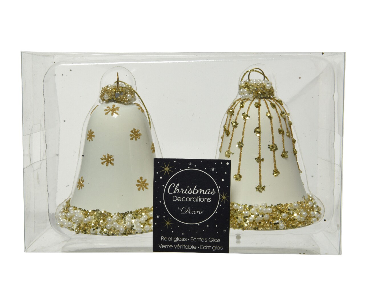 Bell 2 db Díszgömb, Decoris, 6.5x8 cm, üveg, fehér/aranyszín