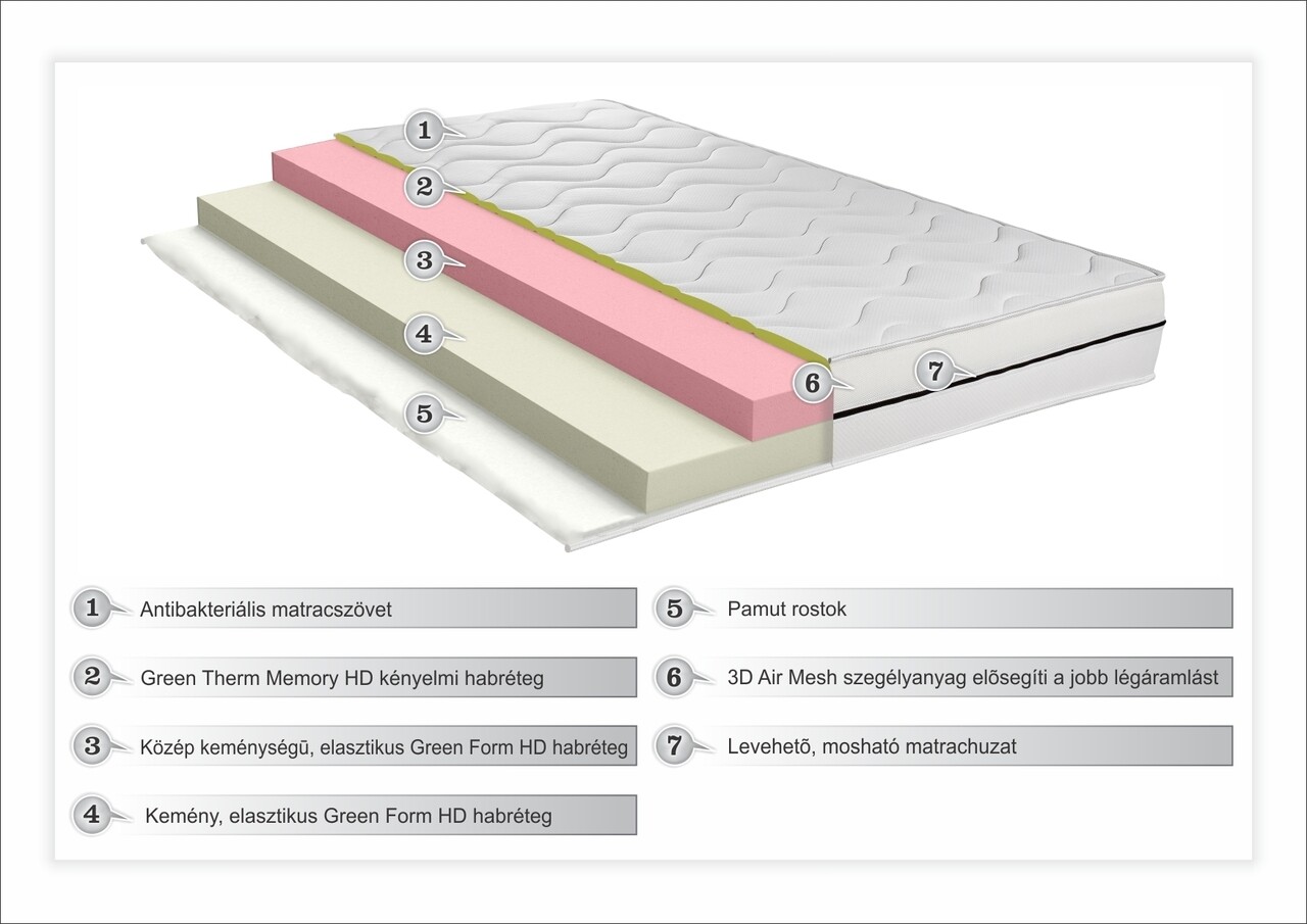 A puha tapintású szövet tetején 2 cm-es Green Therm Memory® habszivacs van. A lágy komfortréteg reagál a testmelegre és penészgombákat képez, megszüntetve az alvás alatti nyomáspontokat az izmok ellazítására és a megfelelő vérkeringés biztosítására. A másik oldala OEKO-TEX minősítésű pamutszálakkal ellátott puha vattaréteggel van steppelve.