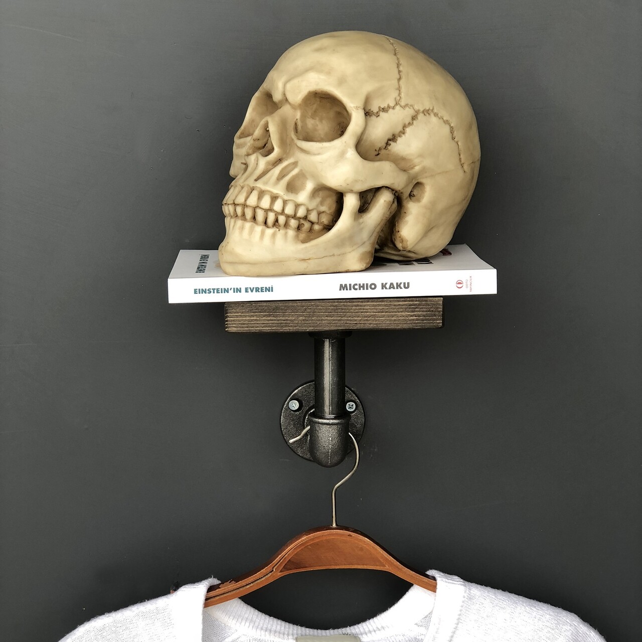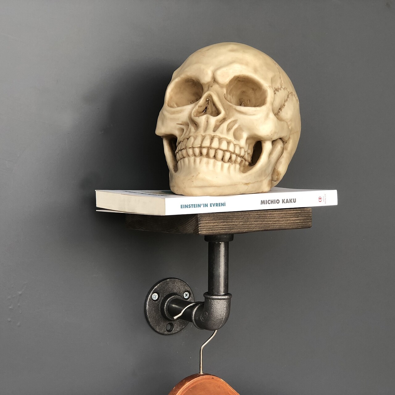 The shelf with hanger stand has a unique design, it is made of a combination of iron and wood, which gives it a masculine air. It fits perfectly in modern interiors and in those with an industrial vibe.