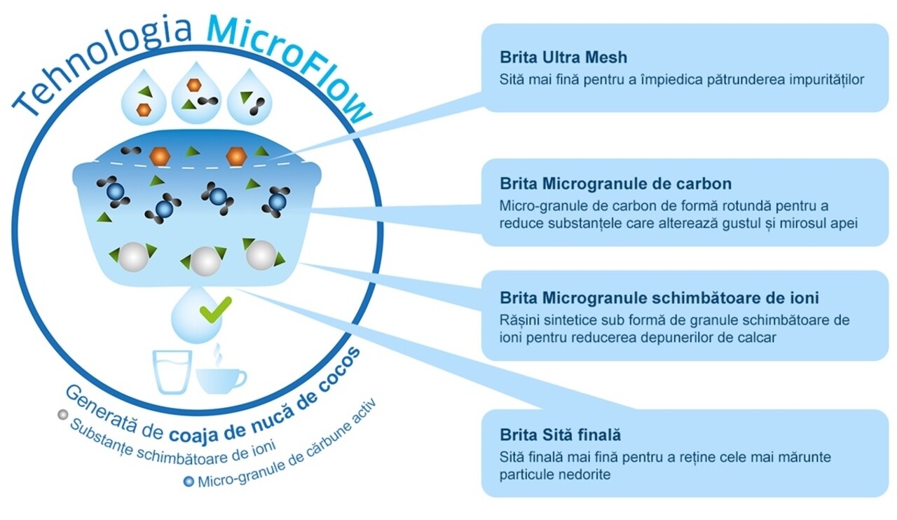 A "Micro Carbon" aktív szén részecskék új formulája, amely kisebb és kerekebb, mint a korábban használtak, hatékonyabban és gyorsabban távolítja el az ízt és szaglást befolyásoló szerves szennyeződéseket. Ugyanakkor az ioncserélő gyanta csökkenti a mészkő és a fémek, például a réz és az ólom szintjét. A BRITA csészék kiváló teljesítménye és a szűrt víz kifogástalan íze elsősorban ezeknek a részecskéknek köszönhető.