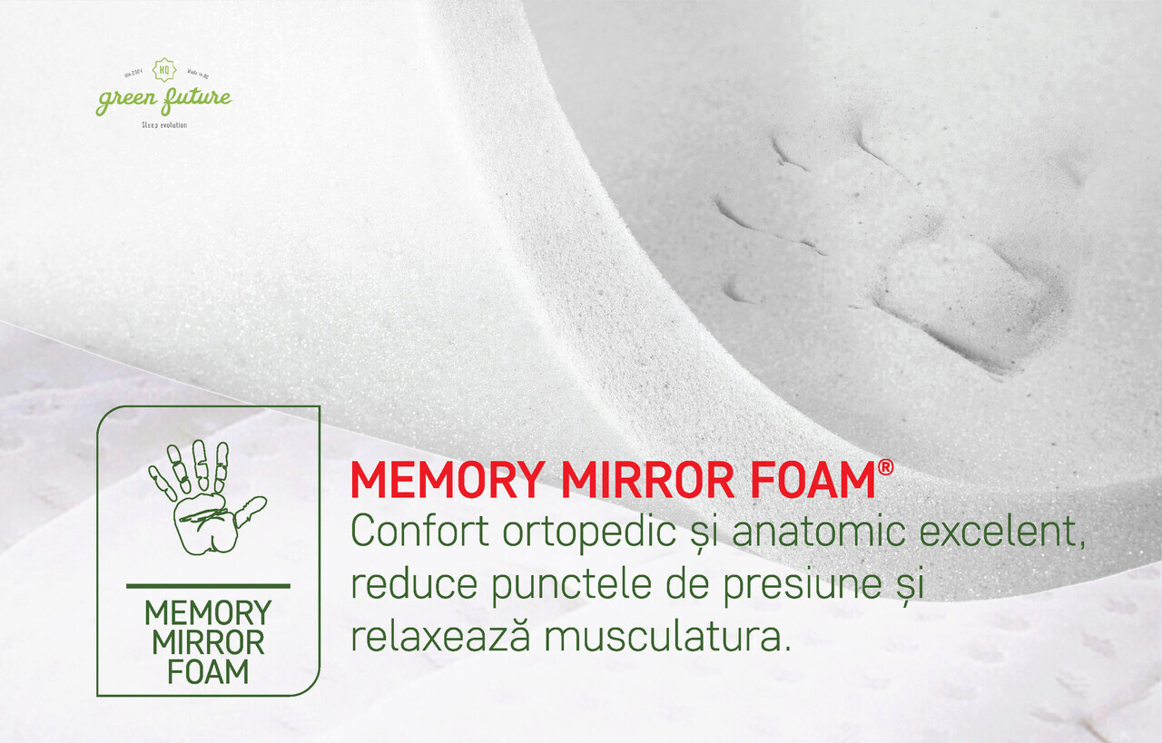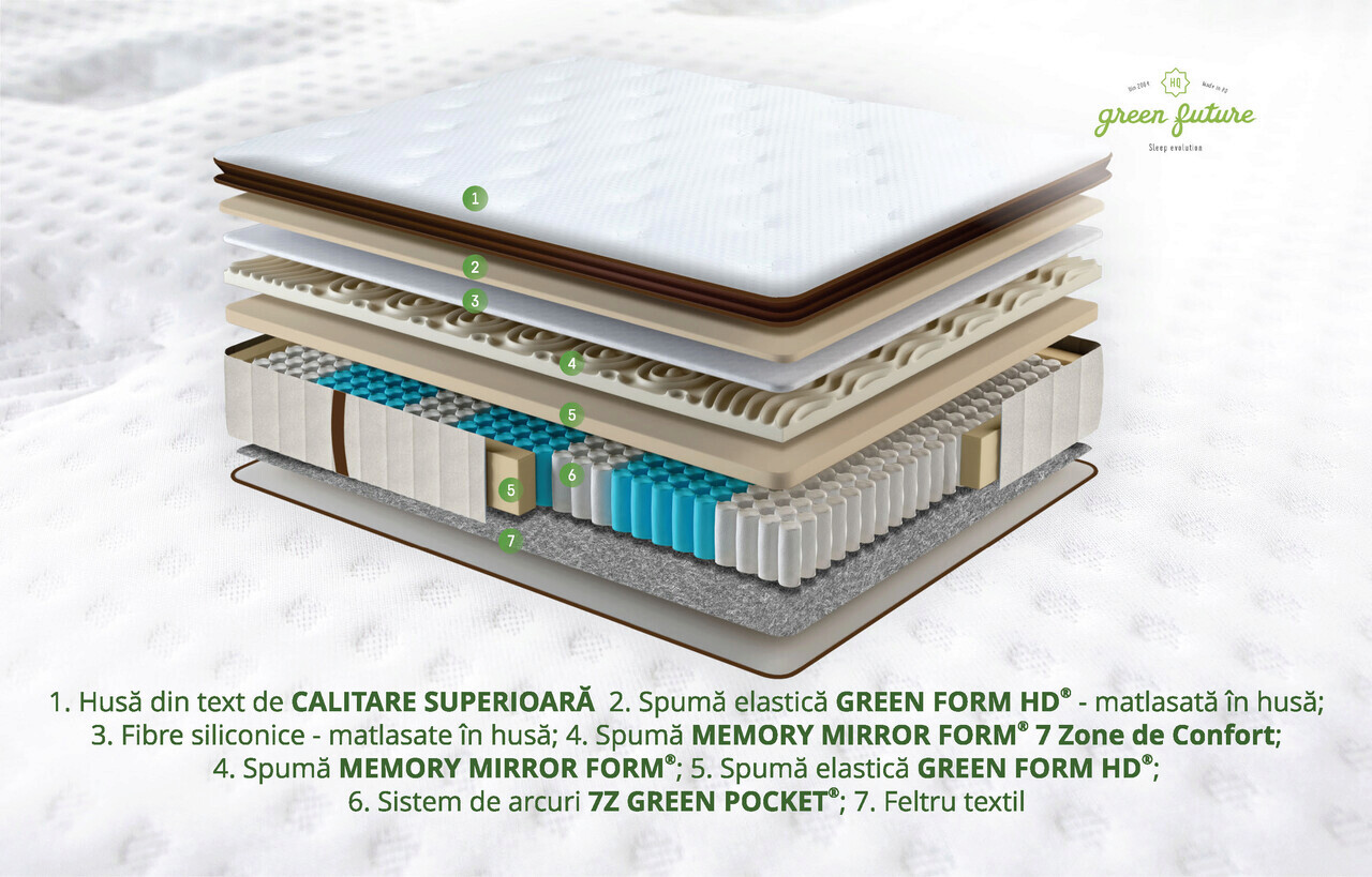 Az anatómiai alvási pozicionálást a szuperelasztikus Green Form HD® nyitott cellás hab és a Memory Mirror Form® habréteg biztosítja, amely alvás közben a nyomáspontokat kiküszöbölve mozog a testen, így ellazítja az izmokat és biztosítja az egészséges vérkeringést.