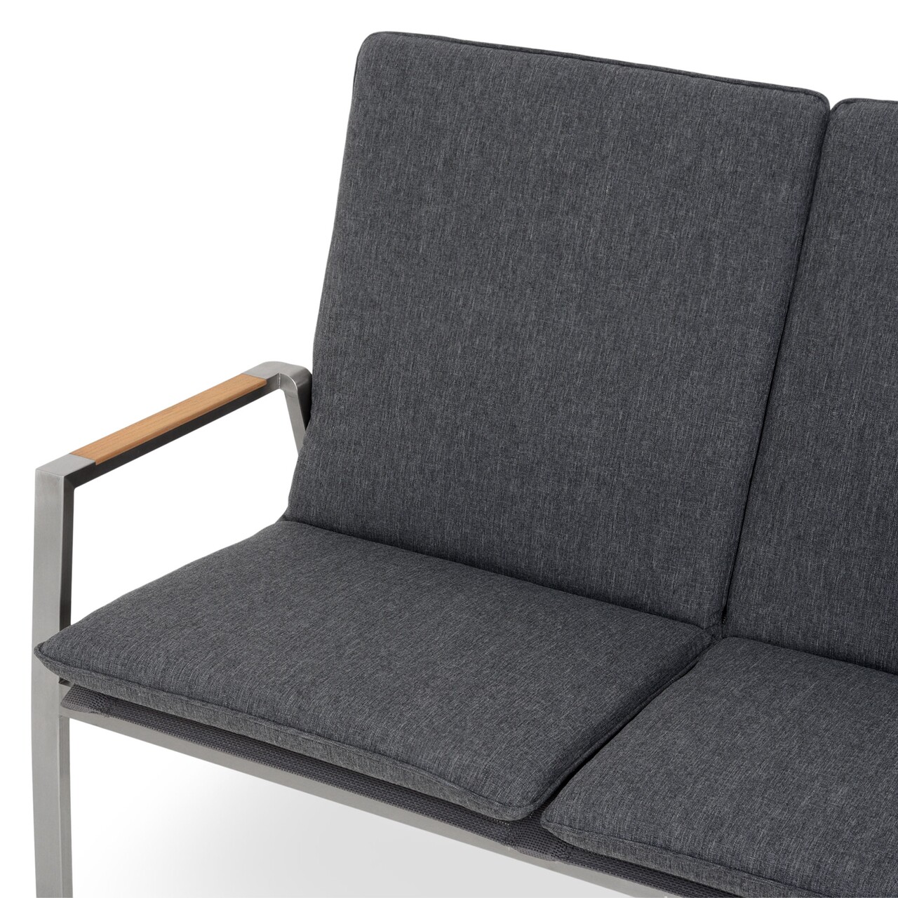 Rozsdamentes acélszerkezetből készült. Az ülés és a háttámla finom 2*1 szövetből készült, UV-védelemmel. Tartalmazza az Olefin szövet párnákat nedvesség és fakulás elleni védelemmel. Teakfa betétek a karfákon.