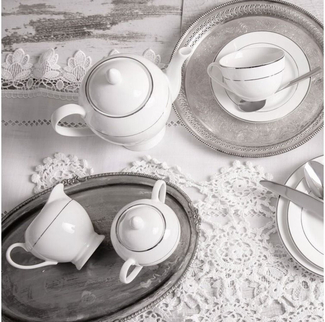 Egy elegáns vonalú ezüsttel dekorált porcelán termék. Klasszikus formával és elegáns dekorációjával tökéletesen illeszkedik a hagyományos belső terekhez, mint a modernhez egyaránt. Kiváló minőségű New Bone China fehér szürke árnyalattal, ellenálló és nagyon exklúzív hatással rendelkezik.