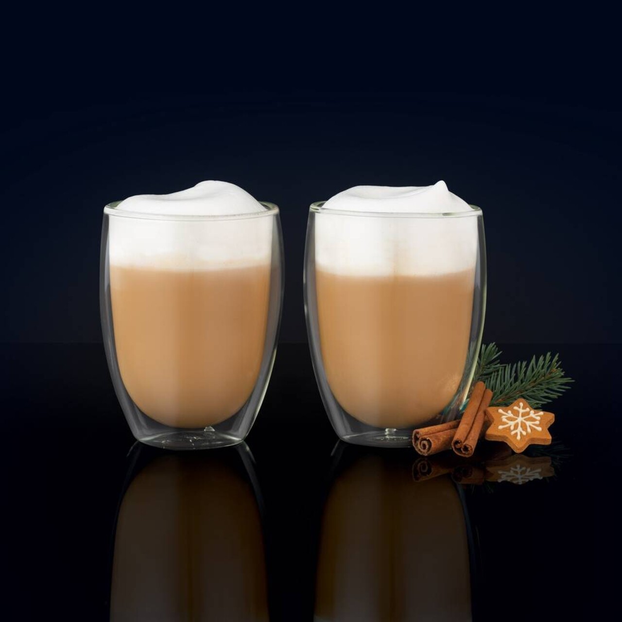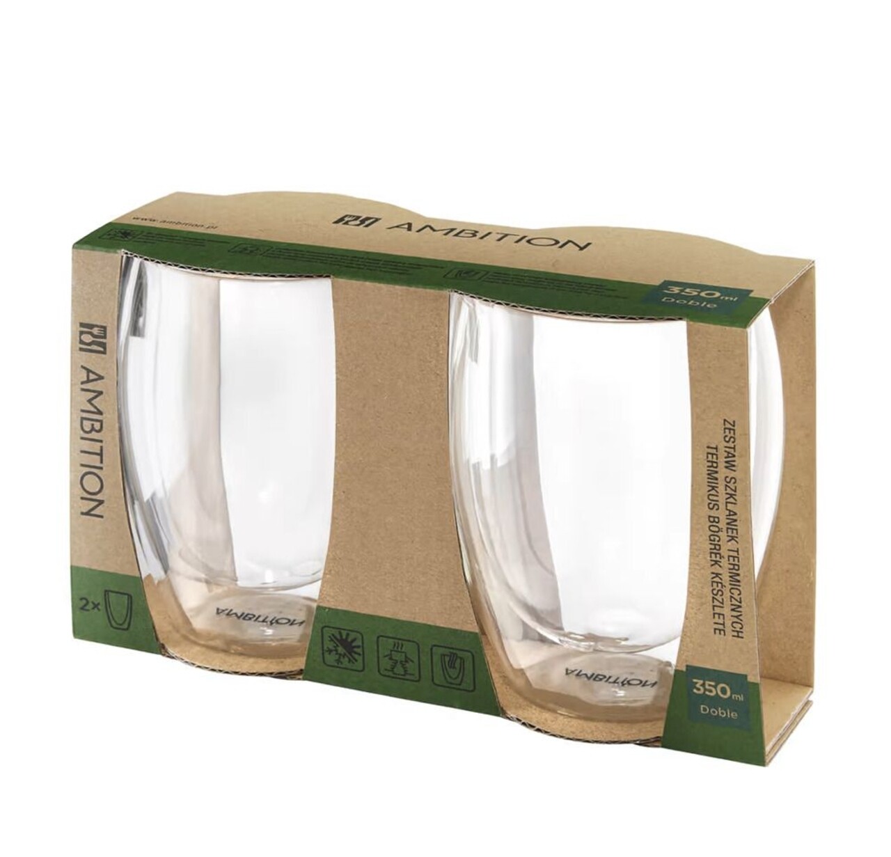A készlet 2 hőálló 350 ml-es csészéből áll. A Doble kollekció hőálló bögréket és poharakat kínál, amelyek hideg és meleg italokhoz egyaránt alkalmasak. Modern, érdekes kialakításúak, és mikrohullámú sütőben és mosogatógépben is használhatók. Különböző kapacitással kaphatók, és hasznos kiegészítői bármelyik konyhának, függetlenül a dekorációtól.