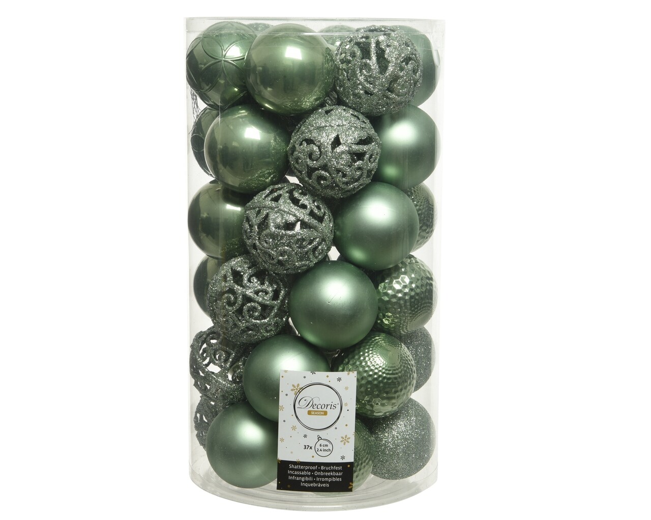 Doboz 37 vegyes gömbökkel Mix, Decoris, műanyag, zsálya zöld
