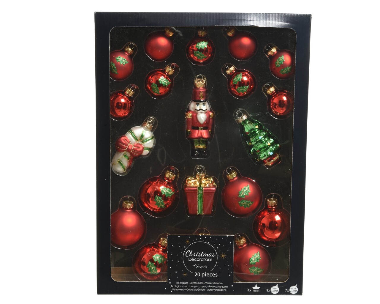 Dobozban 20 Holly mix gömb, Decoris, üveg, piros