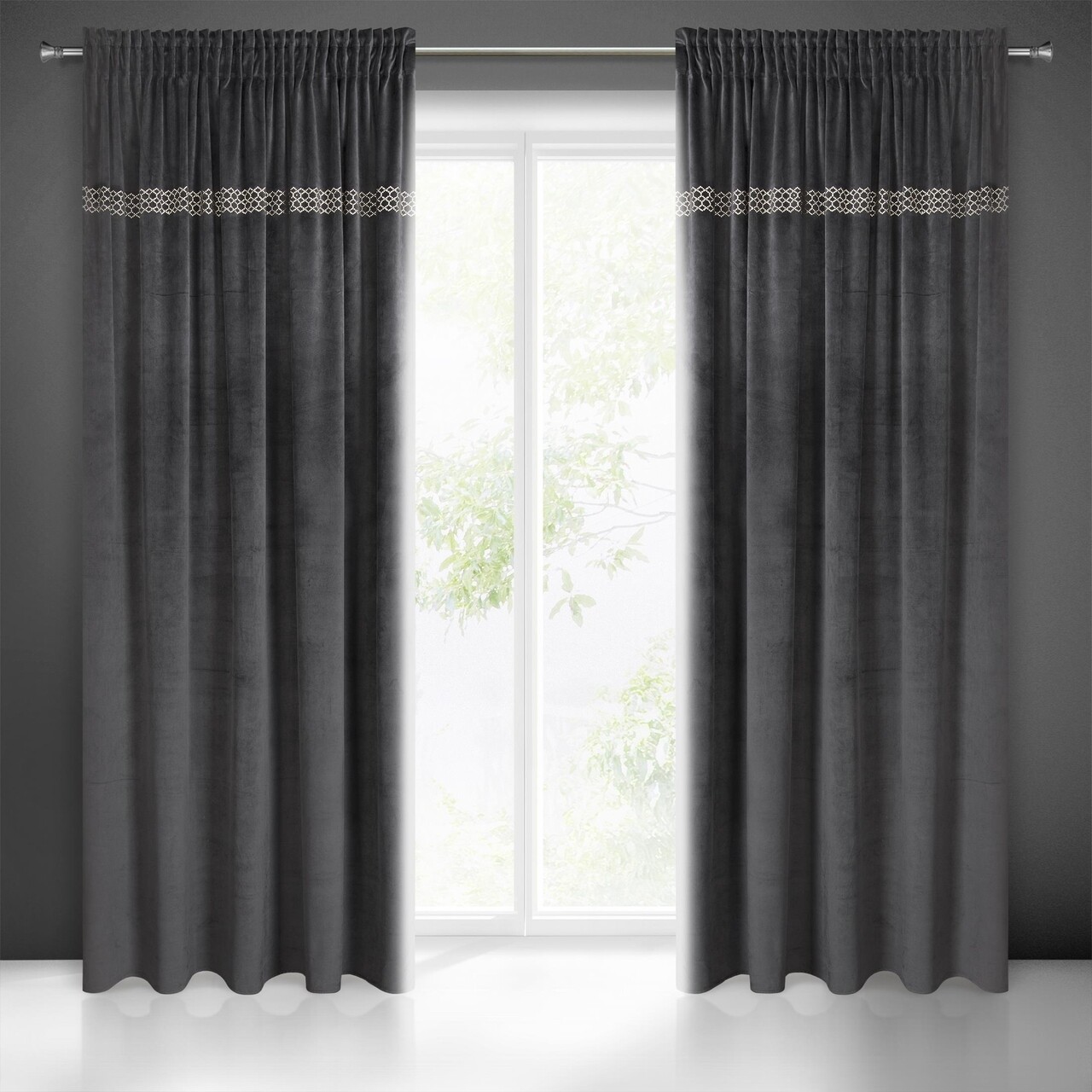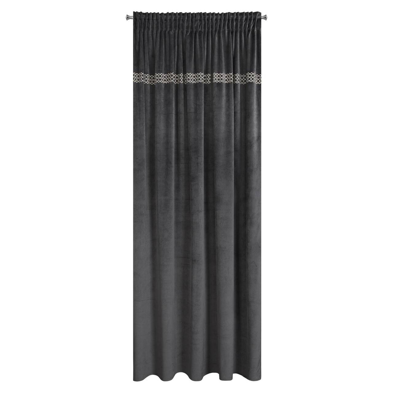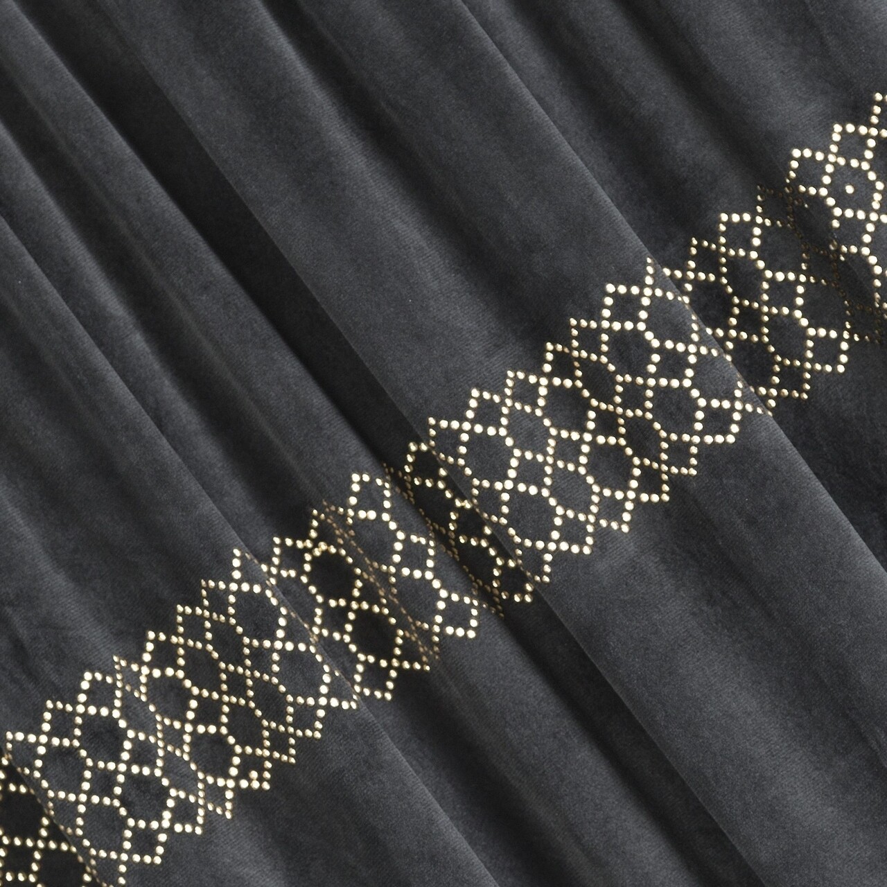 Draperia este confectionata dintr-o tesatura moale din catifea, decorata in partea superioara cu o aplicatie sub forma unei centuri de strasuri mici, stralucitoare, de culoare auriu deschis, dispuse intr-un model geometric. Tesatura moale mata acopera bine fereastra, oferind o atmosfera confortabila in interior. Acesta draperia atragatoare va castiga cu siguranta simpatia iubitorilor de decoratiuni elegante.