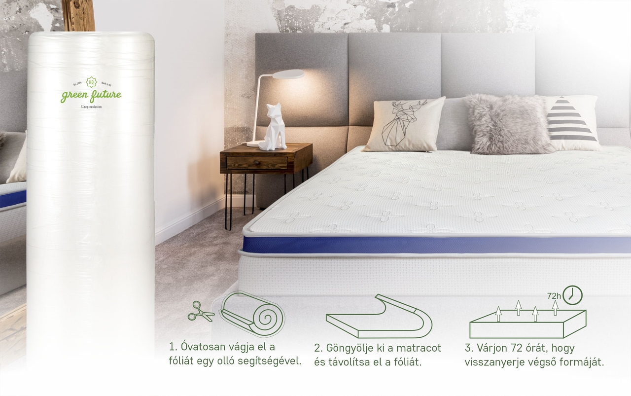 A matrac élettartamának meghosszabbítása érdekében javasoljuk a speciális GREEN-FUTURE védelem megvásárlását. A speciális védelem könnyen karbantartható, lehetővé téve a mosást a mosógépben vagy manuálisan hideg vízzel.