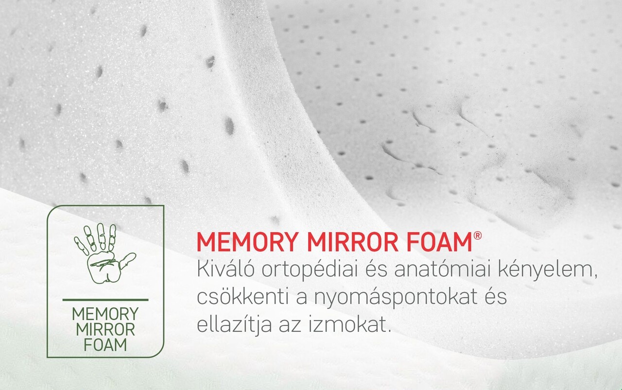 A Memory Mirror Form ® hab memóriarétege a teljes felületen szellőzőnyílásokkal van ellátva a megfelelő szellőzés érdekében, és alvás közben száraz és pormentes környezet fenntartása érdekében.