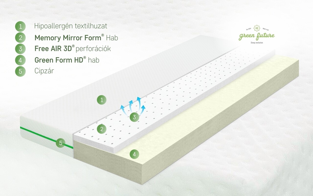 Kiváló minőségű anyagokból készült matrac szerkezete 14 cm-es elasztikus poliuretán habrétegből áll, a Green Form HD®, amely alvás közben biztosítja a gerinc természetes helyzetét, és egy bőséges, 3 cm-es habrétegből álló Memory Mirror Form® , hogy enyhítse a nyomáspontokat (váll, csípő és láb) és teljes izomlazítást biztosítson alvás közben.