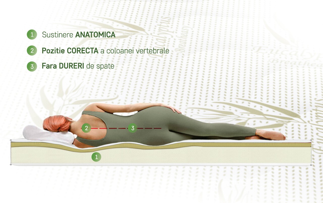 Stressz- és gyulladáscsökkentő hatás: Az eukaliptusz illóolajokat tartalmazó kapszulák aromája kiváló stimuláns a relaxációhoz és a stresszoldáshoz. Ezenkívül jól ismertek az eukaliptuszolajok légzőszervi megbetegedések fertőtlenítő és gyulladáscsökkentő hatásai. Az elmúlt években végzett vizsgálatok azt mutatják, hogy az eukaliptuszolajokkal végzett terápiák után javult az immunrendszer. A Green Form HD® támasztóhab és a Green Therm Memory® réteg fejlett technológiája biztosítja az alvást a partner mozgásának terjedése nélkül.