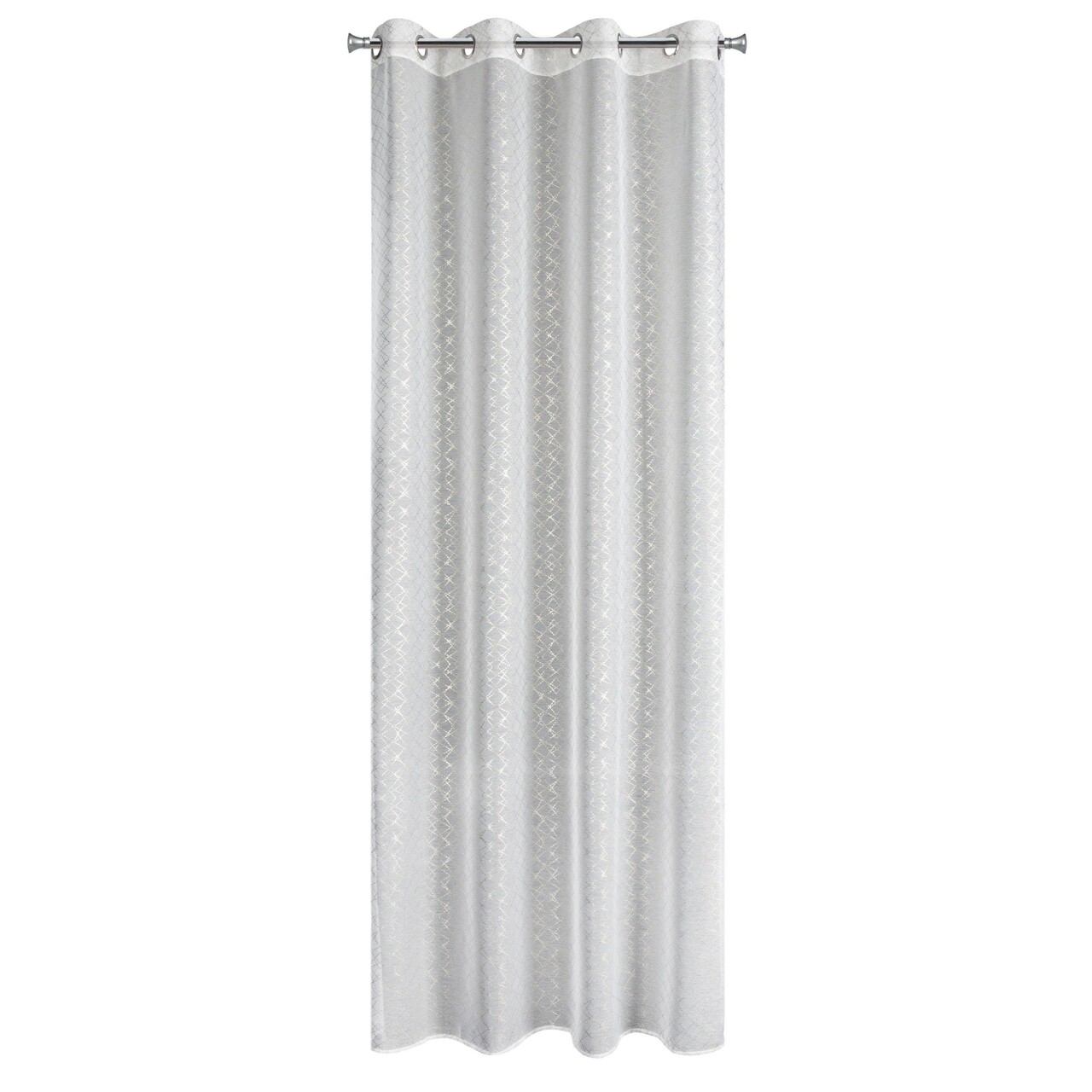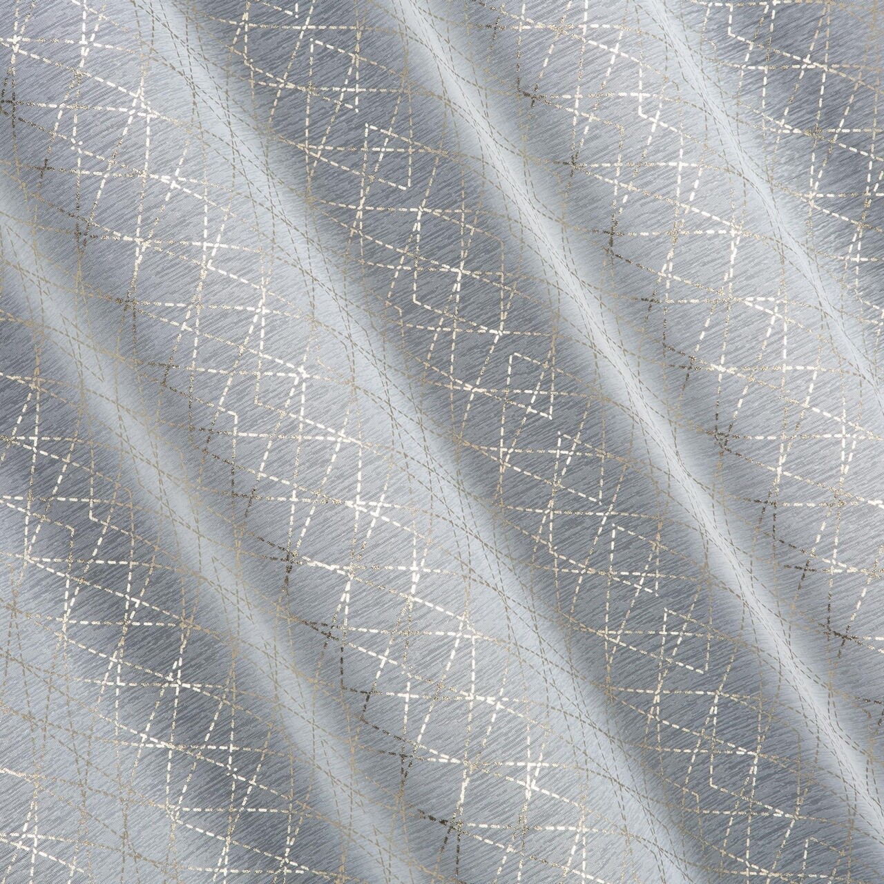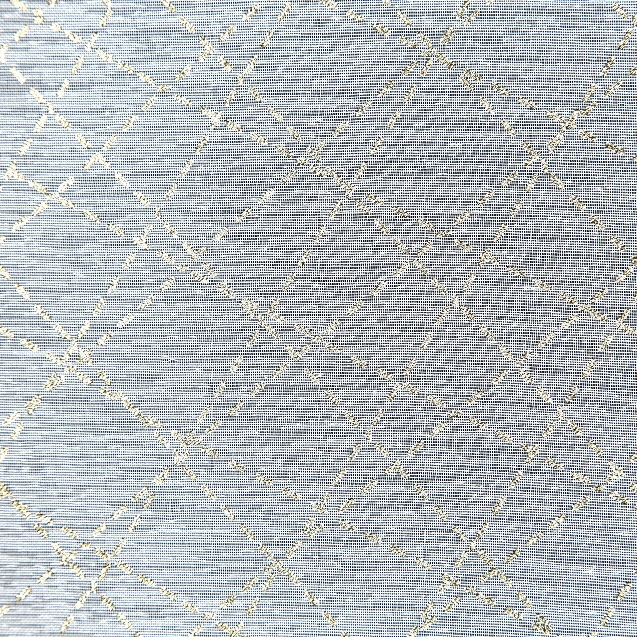 A fehér Fibi függöny teljes felületén modern elemekkel díszített, geometrikus aranynyomat formájában.
