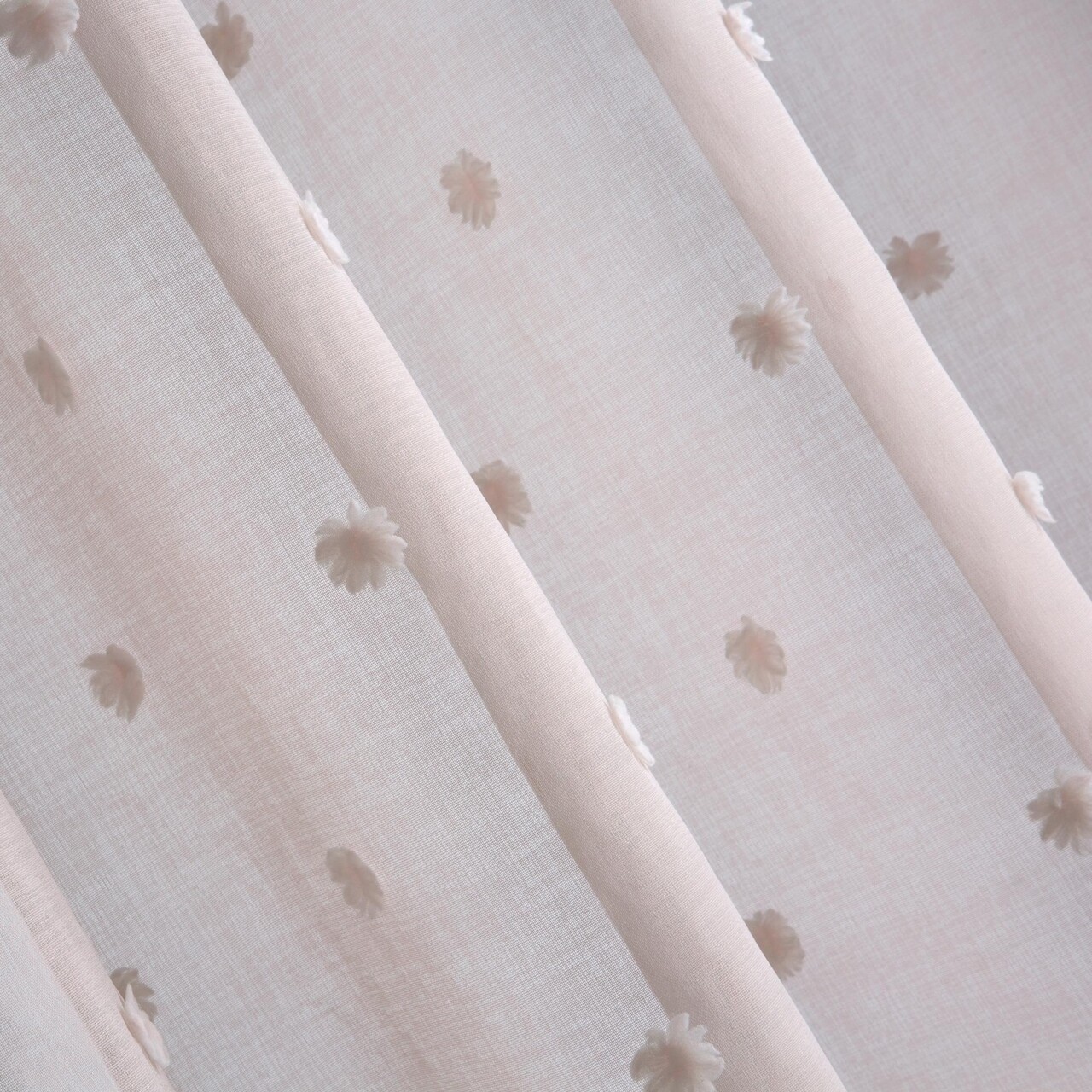 Könnyű szövetfüggöny, finom alkalmazásokkal díszítve varrott golyók formájában.