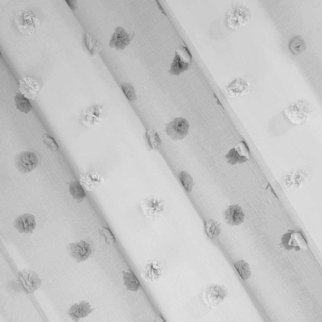 A Stella függönyt felül egy puha, háromdimenziós pöttyös szövetcsík díszíti. A bolyhos, domború elemek kiemelkednek az átlátszó, puha anyagon, hangsúlyozva a függöny egyediségét és eredetiségét.