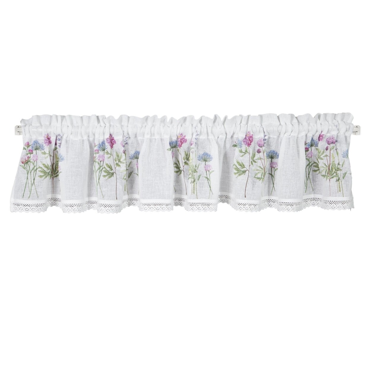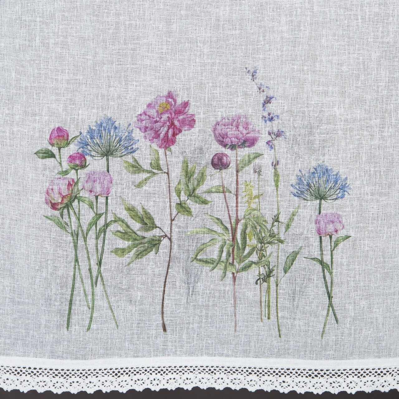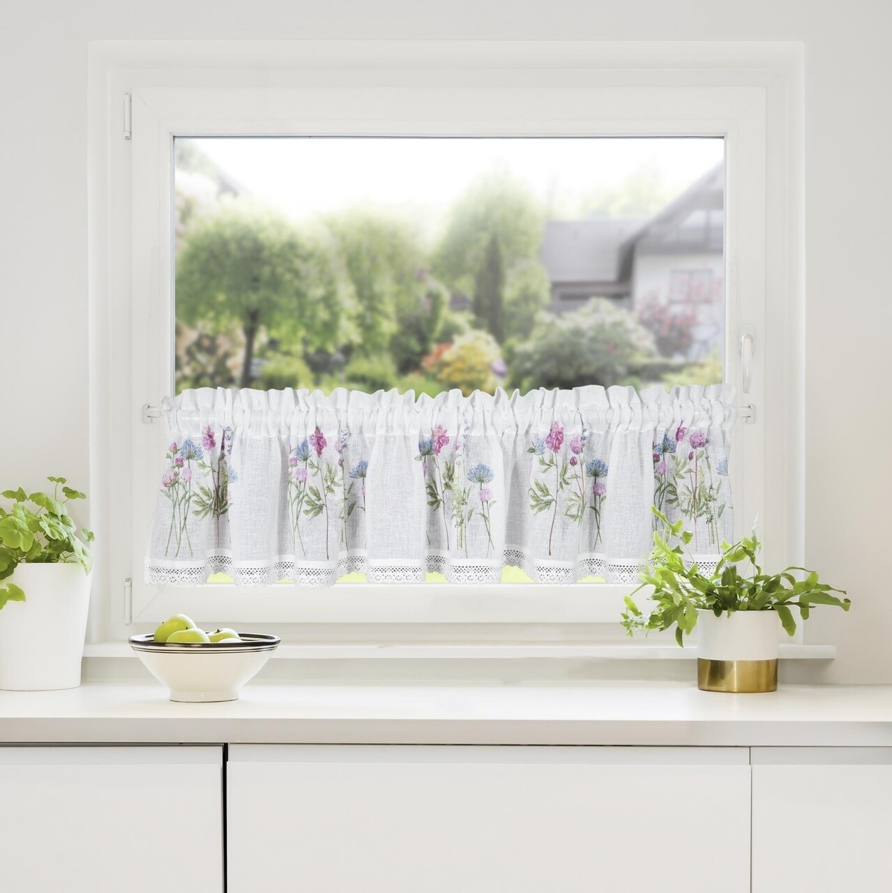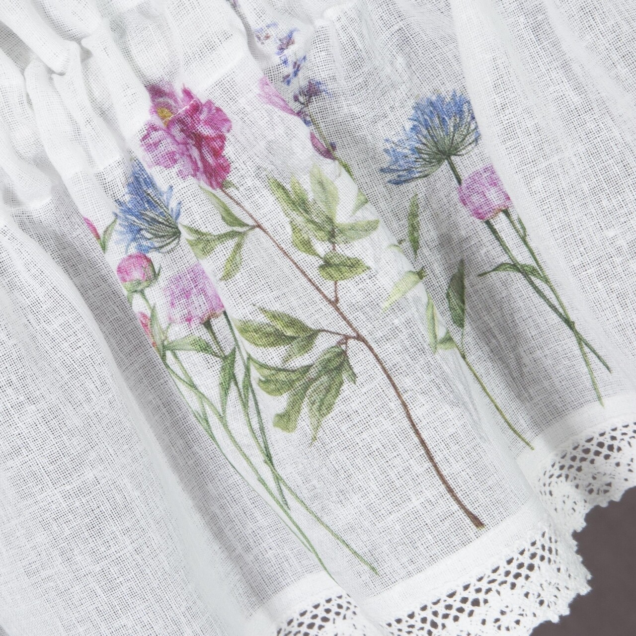 A rusztikus stílusú kiegészítők barátságos és kényelmes jelleget kölcsönöznek a belső térnek. Ilyen hangulatot biztosít a konyhájában a Laura függöny segítségével. Nyári virágokkal van nyomtatva, és pamut csipkével van ellátva.