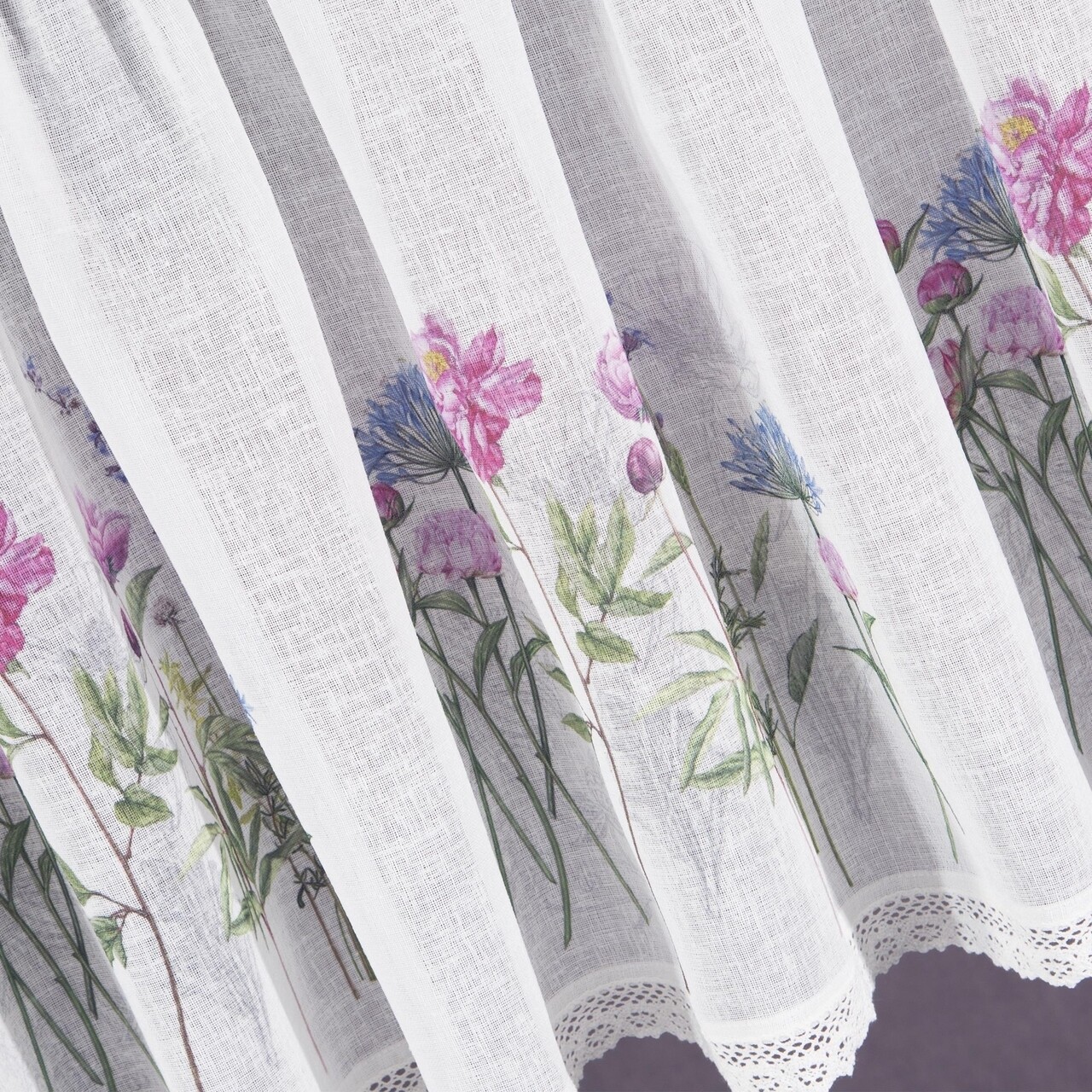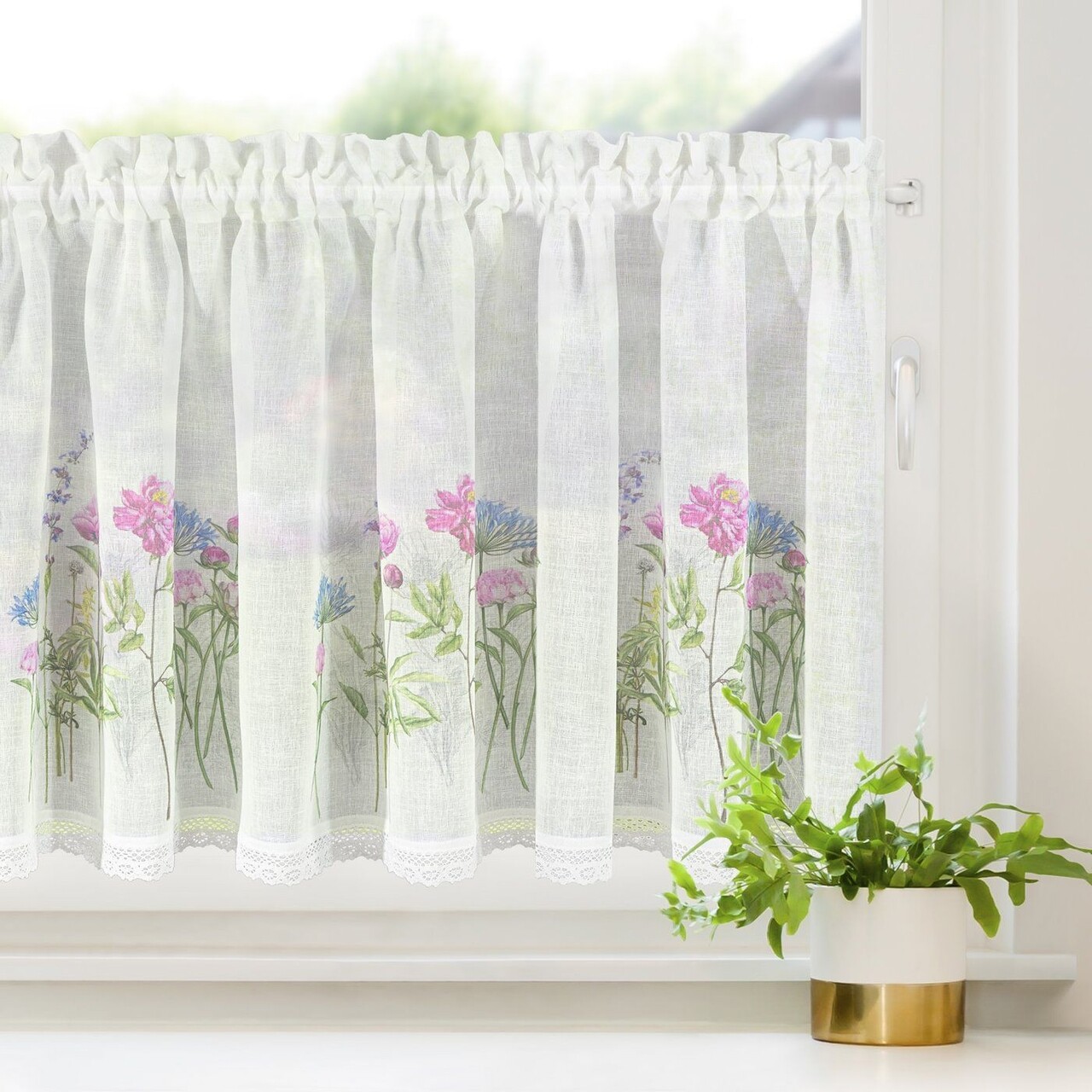 A rusztikus stílusú kiegészítők barátságos és kényelmes jelleget kölcsönöznek a belső térnek. Ilyen hangulatot biztosít a konyhájában a Laura függöny segítségével. Nyári virágokkal van nyomtatva, és pamut csipkével van ellátva.