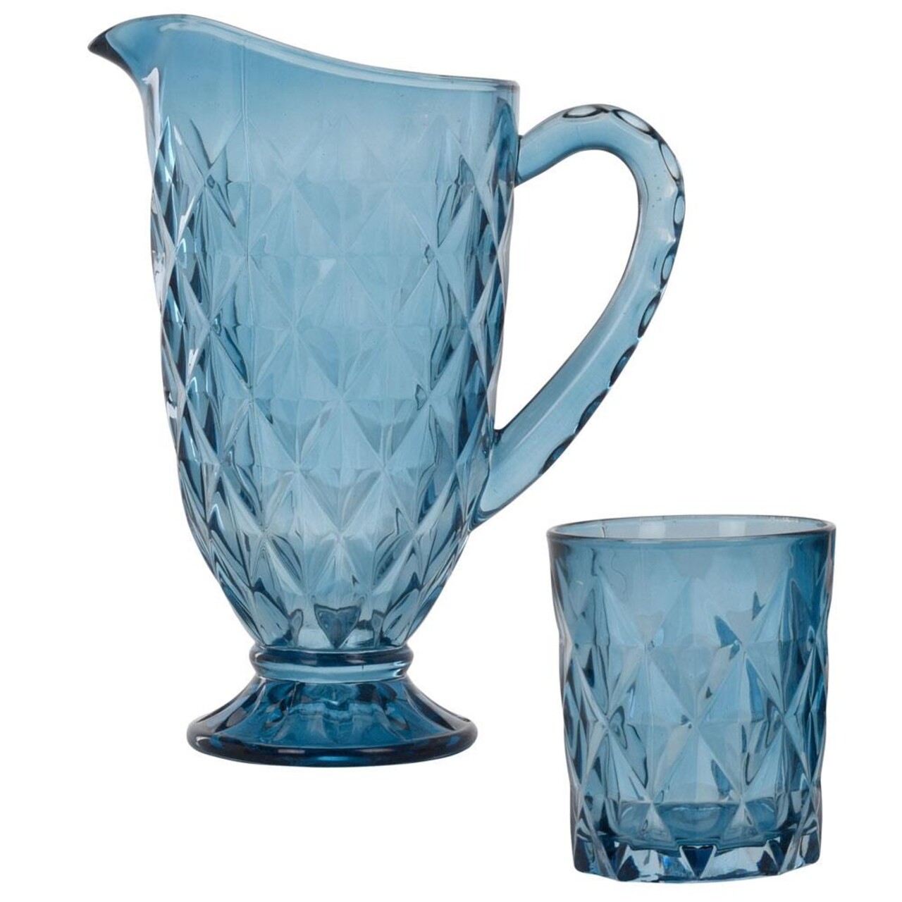 Excellent 6 db Pohár kancsóval, 250ml/1L, üveg, kék