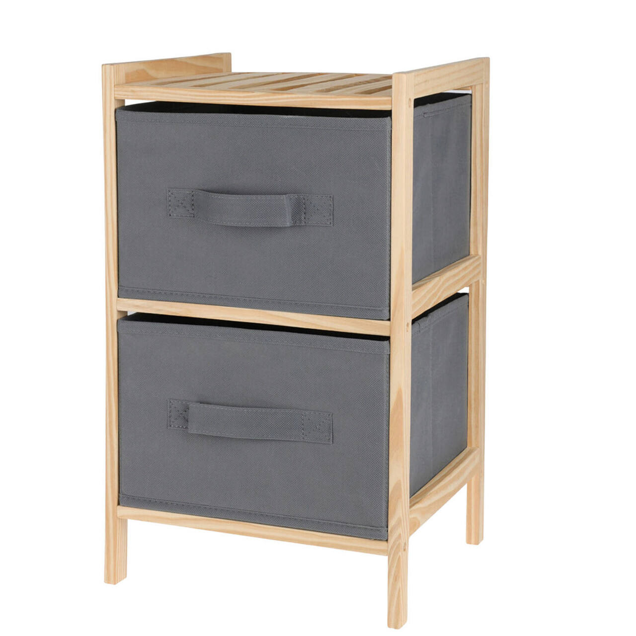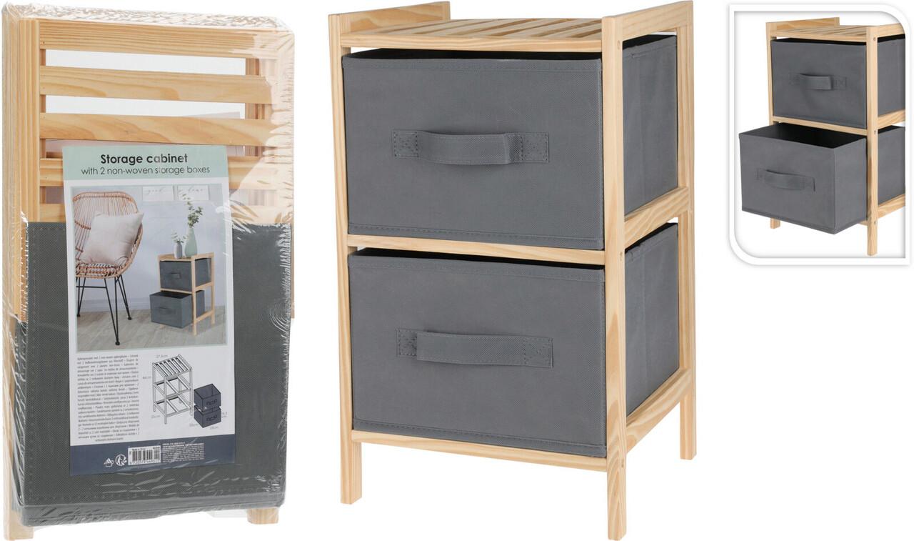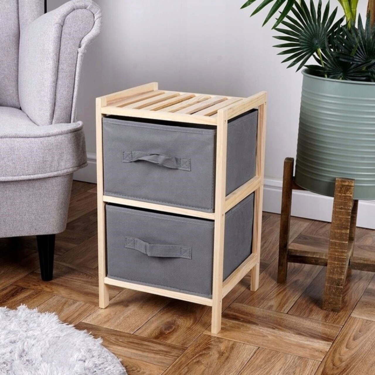 2 fiókos textilszekrény természetes fenyőfából, világos színben. Szürke nem szőtt anyagból készült fiókok.