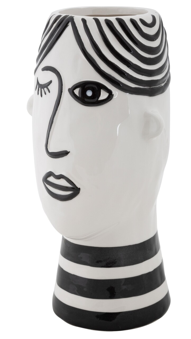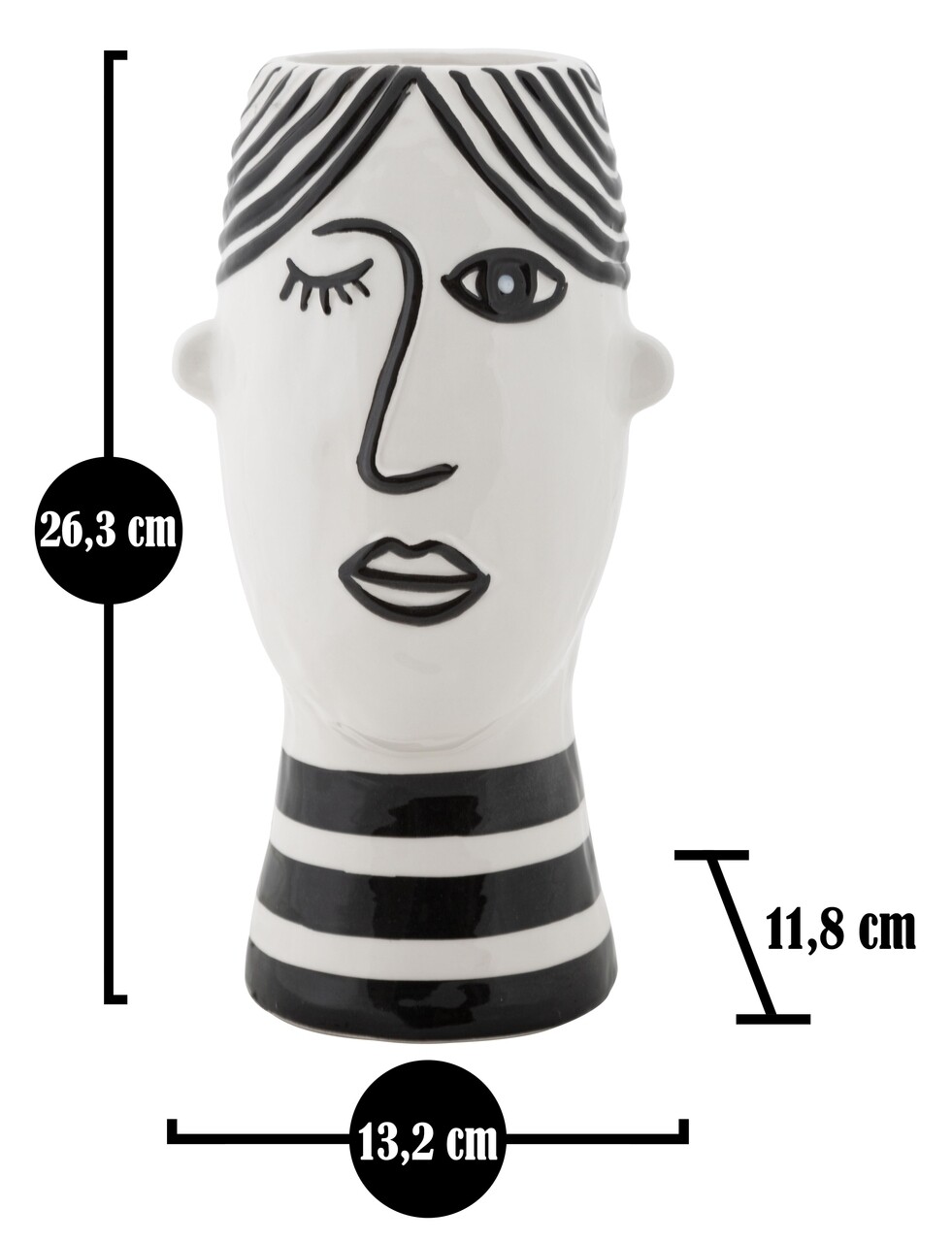 A fehér porcelánváza egy arcot ábrázol. Hangsúlyos fekete körvonalai a futurizmus és a kubizmus művészetére emlékeztetnek.
