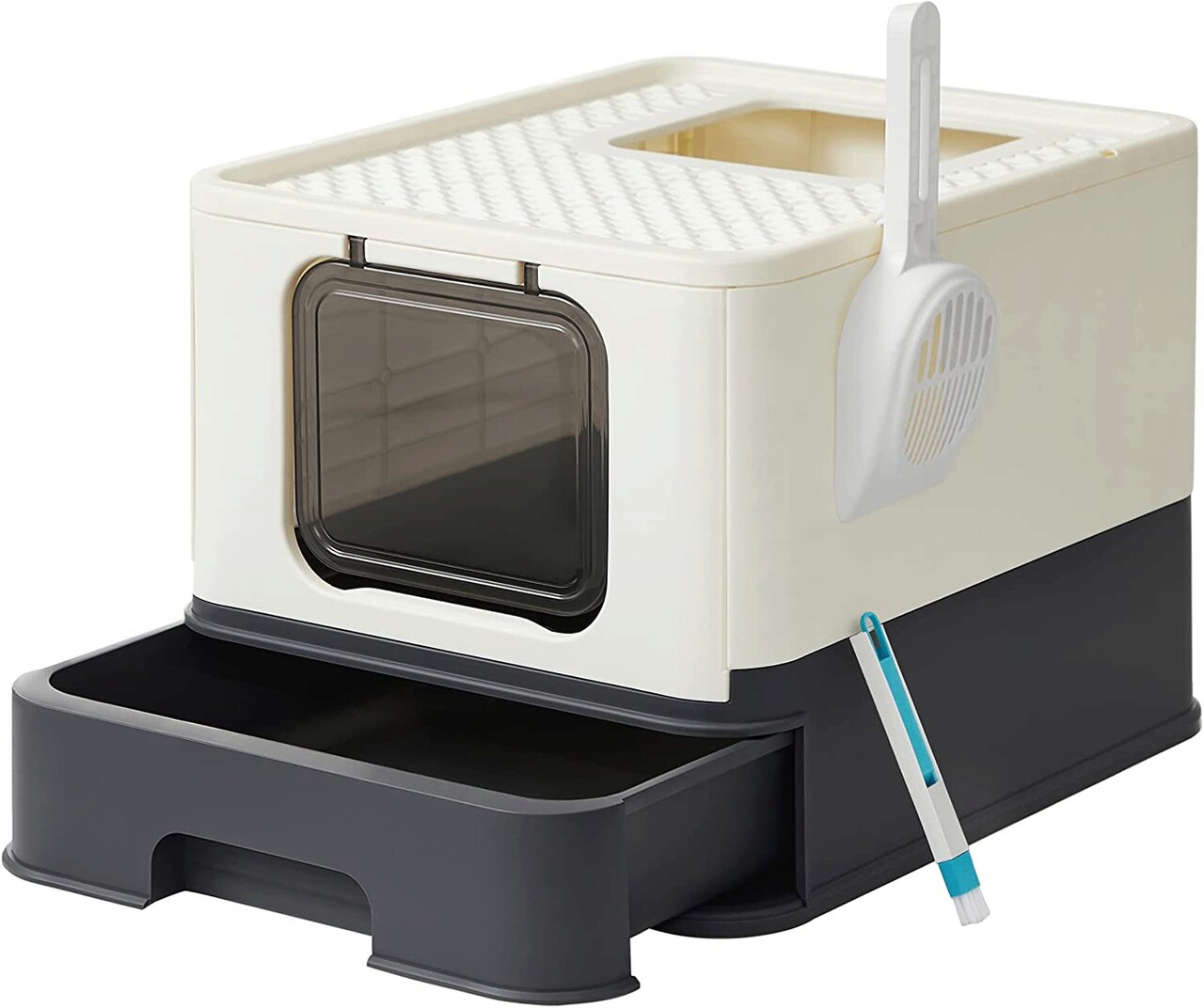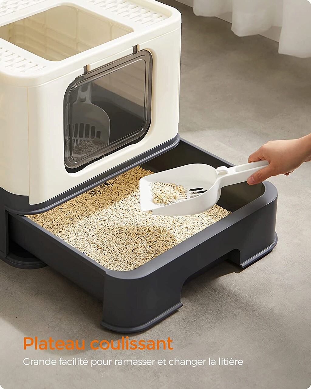 Könnyen üríthető és tisztítható: ez a macskaalom-tálca kihúzható fiókkal rendelkezik, amely megkönnyíti az ürítést és az új alommal való feltöltést. Az alom kikanalazásához és az alomtálca tisztításához egy lapát és egy kefe is tartozik hozzá.