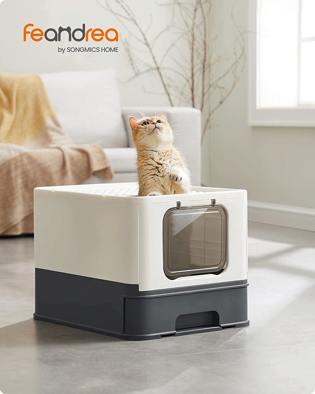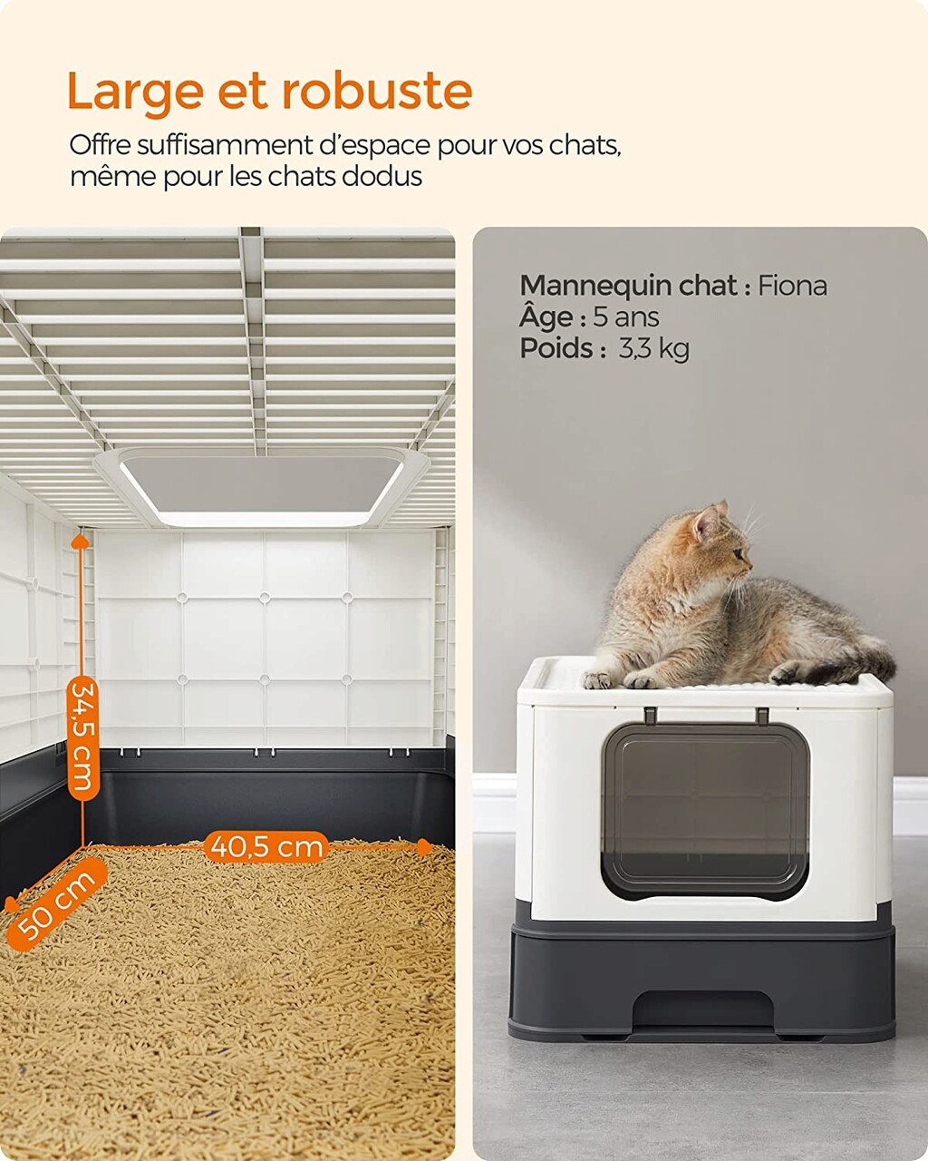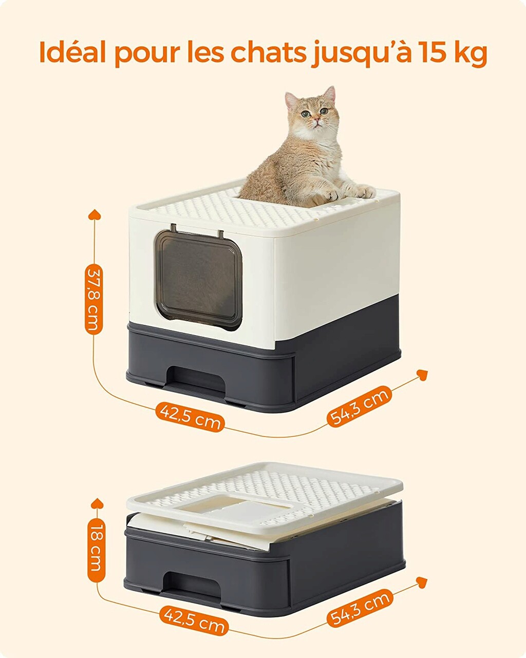 Tökéletes nagy és duci macskák számára: Az alomtálca belső méretei 40,5 x 50 x 34,5 cm-esek, így elegendő helyet biztosít nagytestű macskák számára. A tetején akár 15 kg is elfér.