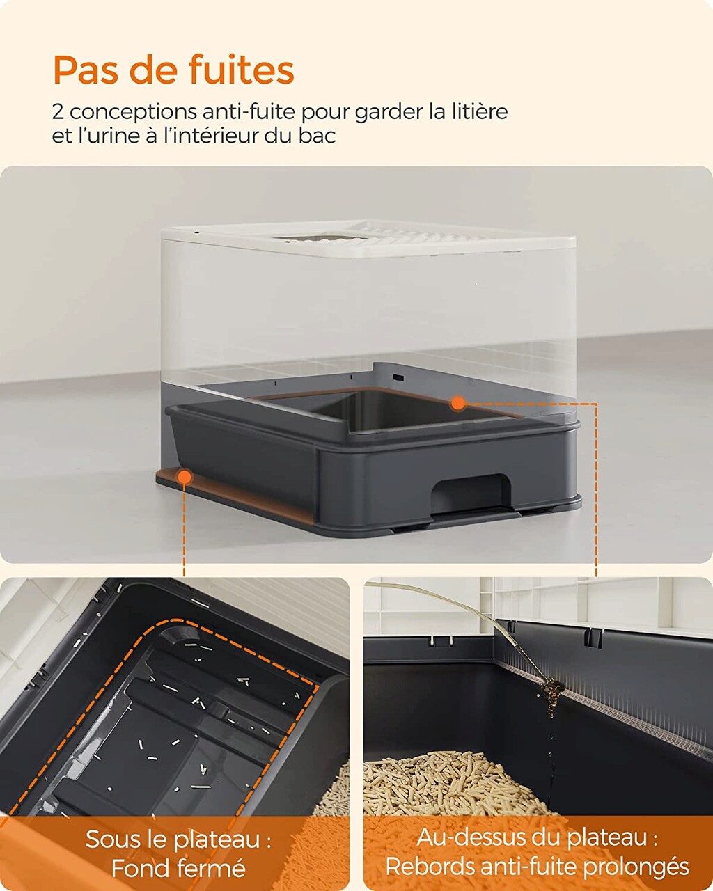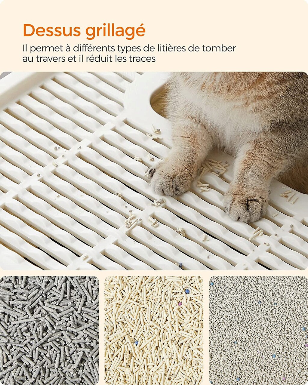 Kevesebb rendetlenség: a tetején található rács minimalizálja a lábnyomokat, és lehetővé teszi, hogy a homok visszahulljon a dobozba. A doboz tetején lévő meghosszabbított perem és az alatta lévő zárt alj megakadályozza, hogy az alom vagy a macskavizelet a padlóra kerüljön.