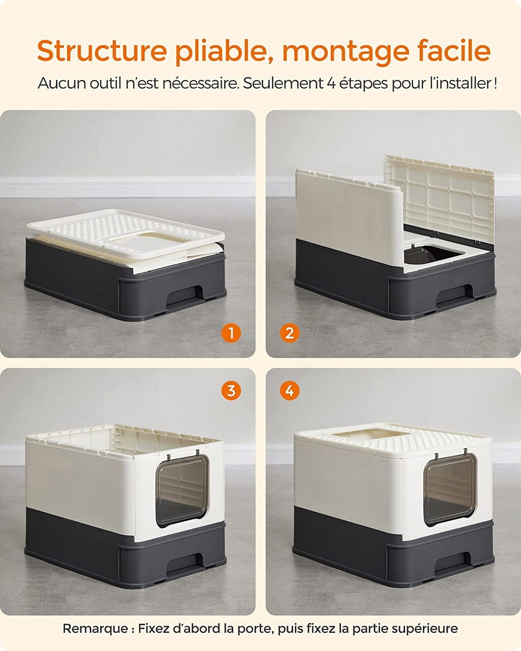 5 perc alatt telepíthető - nincs szükség szerszámokra. Az összecsukható kialakításnak és a könnyen követhető utasításoknak köszönhetően macskája új alomdoboza kevesebb mint 5 perc alatt kész.