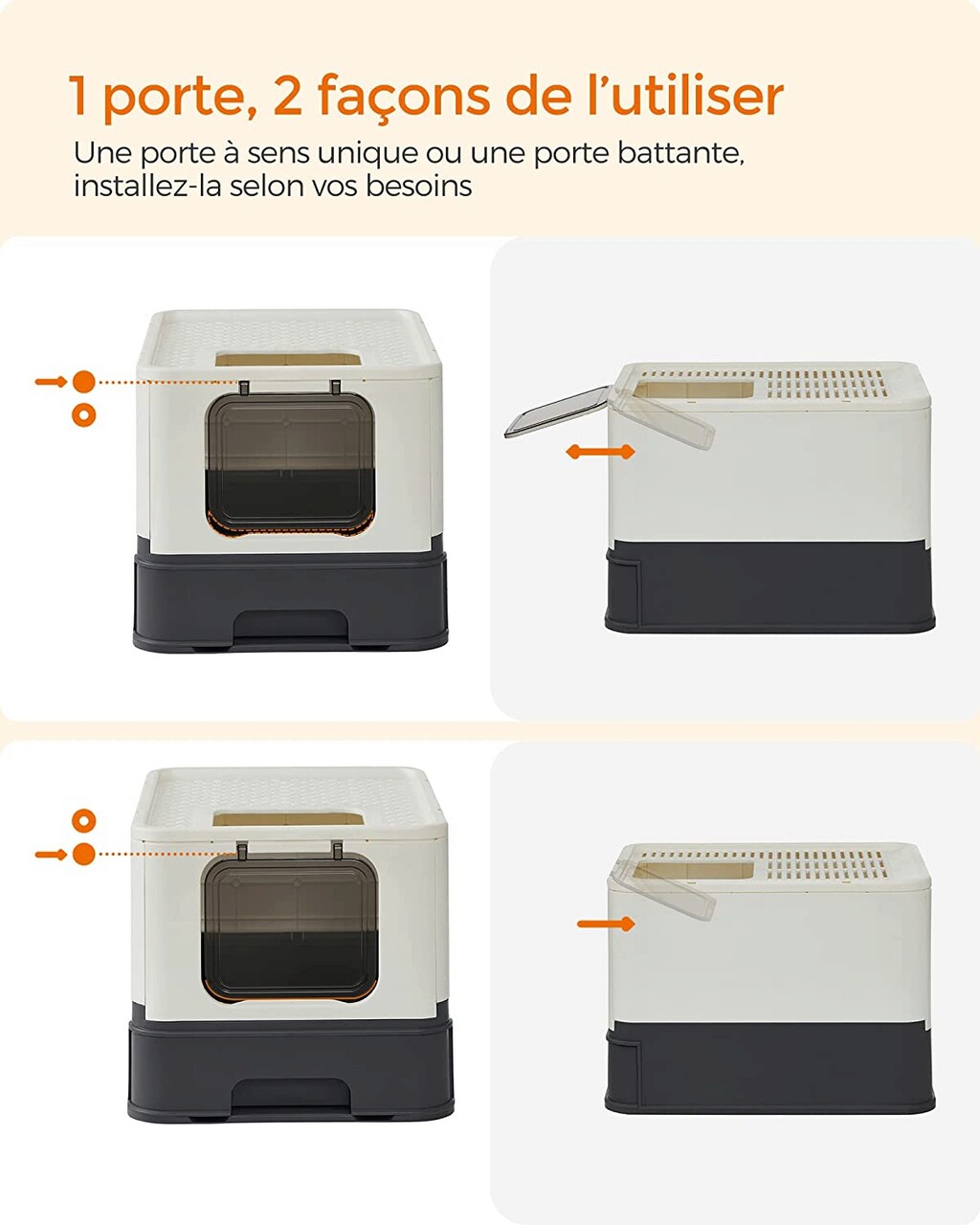 1 ajtó, 2 konfiguráció: az ajtó úgy állítható be, hogy csak az egyik oldalon nyíljon, a tetején lévő nyílás pedig kijáratként használható. Az ajtó mindkét oldalon nyitható is - az Ön igényeitől függően. Ha a macskája kezdő, az ajtó eltávolítható is.