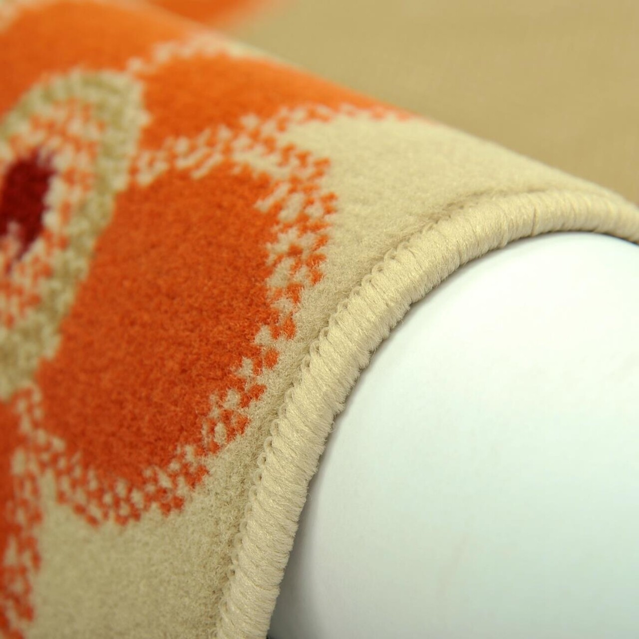 A szőnyeg a legmagasabb minőségű polipropilénből készült, 7 mm-es fonallal, téglalap alakú, világos, természetes színekkel, feldobja a belső teret, és kényelemmel és színekkel melegíti fel. A narancssárga, barna és piros színű nagy, stilizált virágok optimizmust, jó ízlést és modernitást sugallnak. A barna zsenília és a színes virágok világos bézs alapon helyezkednek el, és téglalap alakú formájának köszönhetően tágas nappaliba és modern hálószobába egyaránt illik. Padlófűtéshez is alkalmas.