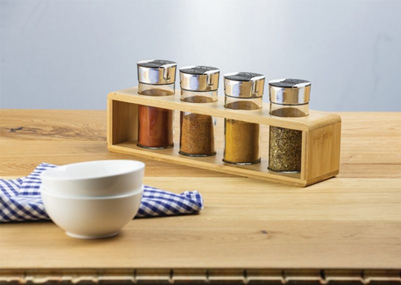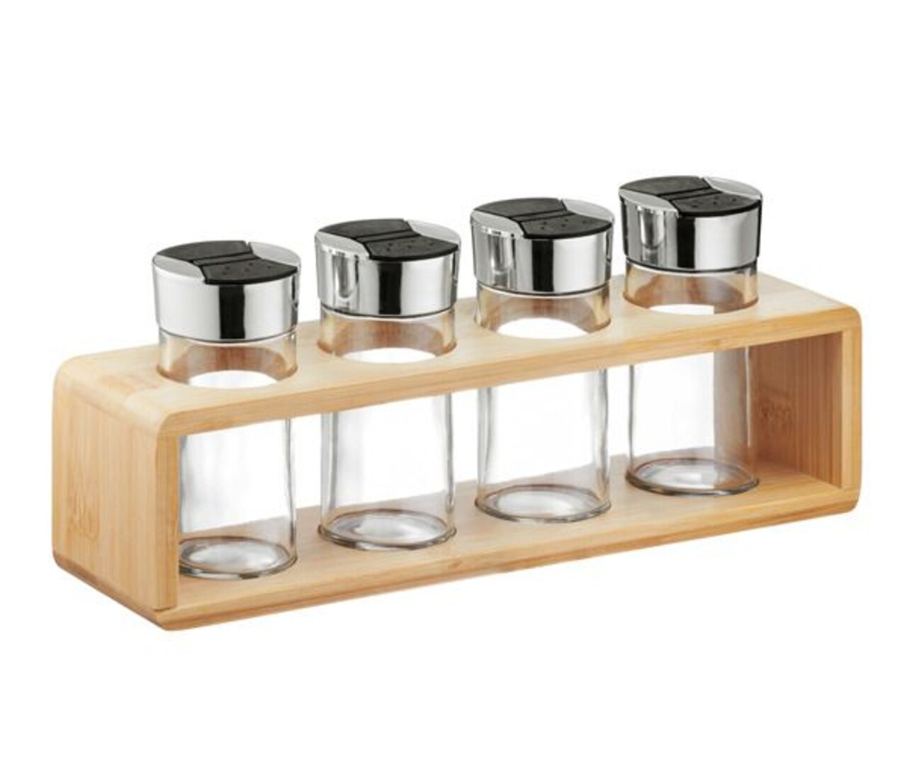 A fűszerkészlet 4 db fedeles üvegedényből és egy modern kialakítású bambusz állványból áll, mely sikeresen használható otthon a konyhában vagy akár éttermekben, nyári teraszokon is. A tartályok üvegből készültek, lehetővé teszik a tartalom egyszerű azonosítását. A készlet nagyon hasznos és praktikus, tartós anyagokból készült.