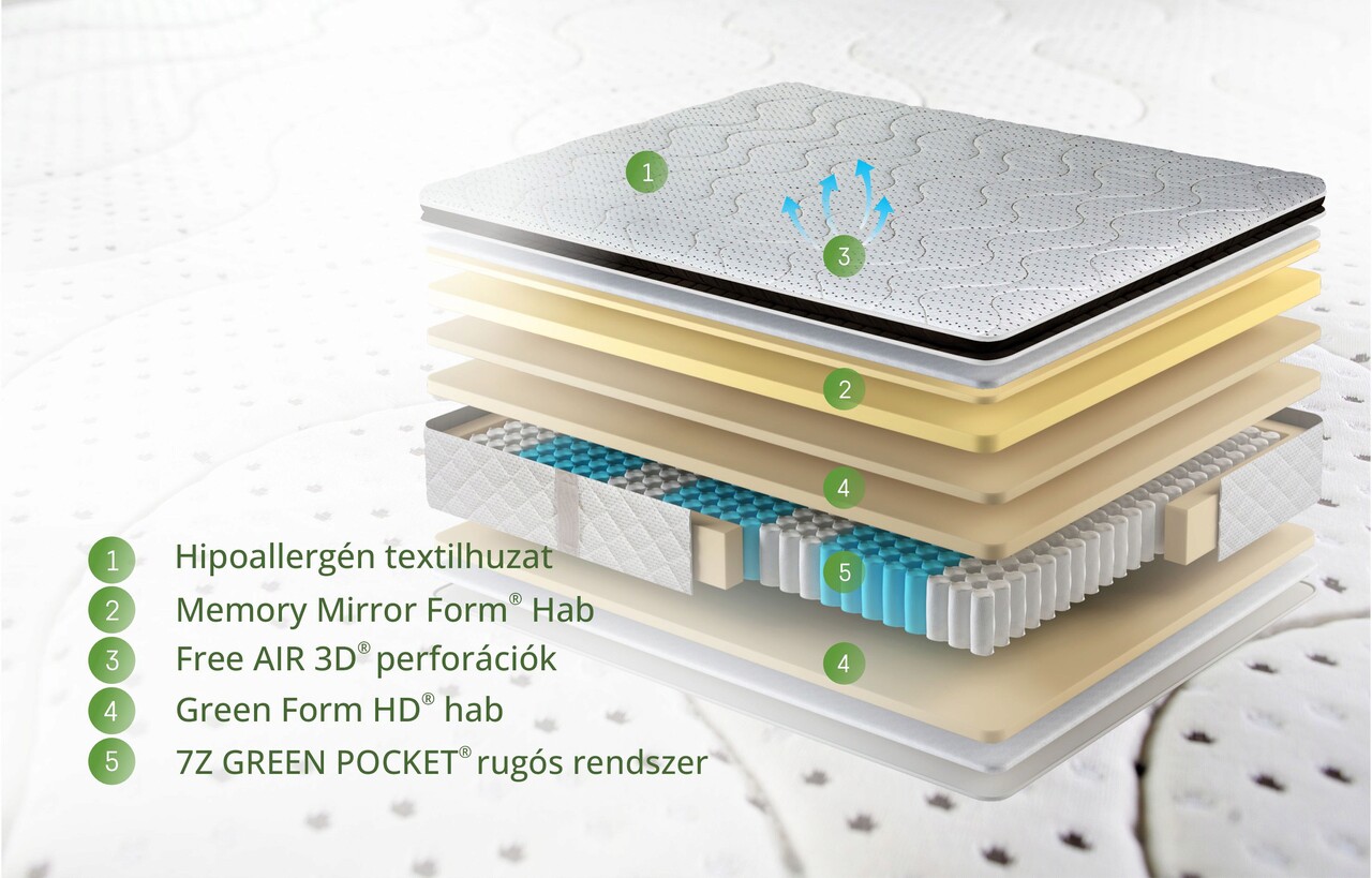 A 7Z Green Pocket® Spring rendszer fejlett technológiája, valamint a Green Therm Memory ® réteg technológiája biztosítja az alvást a partner mozgásainak észlelése nélkül.