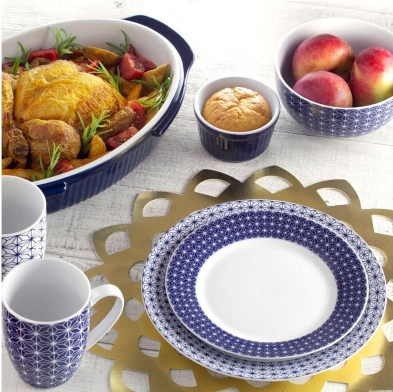 Extra fehér porcelánból készült, díszített geometrikus formával. A klasszikus forma és a lakkréteg alatti díszítések hatására ezek a tányérok megváltoztatják az egész asztal megjelenését. 3 színben találhatók: sötétkék, piros és szürke. Mosogatógépben mosható.
