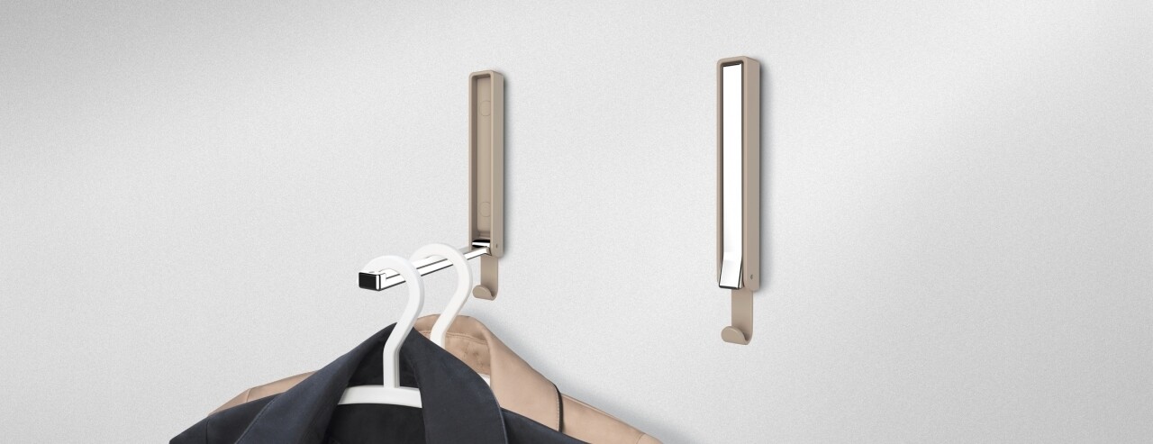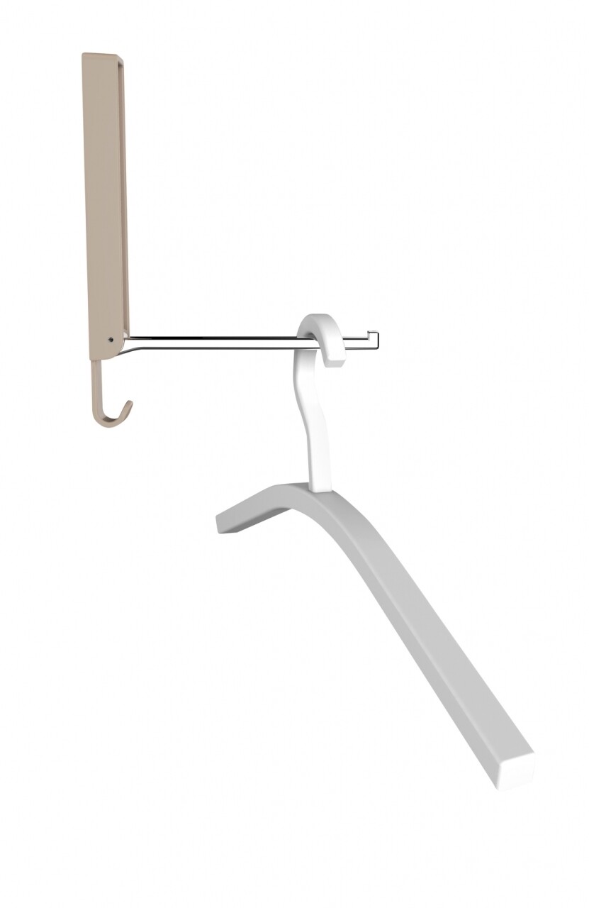Az akasztón van egy akasztó, amely akkor húzódik meg, amikor nem használják, hogy ne foglaljon sok helyet. Könnyen megfogható, tartós, krómozott fém, műanyag és mágnes kombinációjából készül.